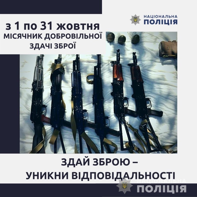 З метою протидії незаконному розповсюдженню зброї, боєприпасів та вибухових матеріалів на території держави з 1 по 31 жовтня 2019 року розпочнеться місячник добровільної здачі зброї.