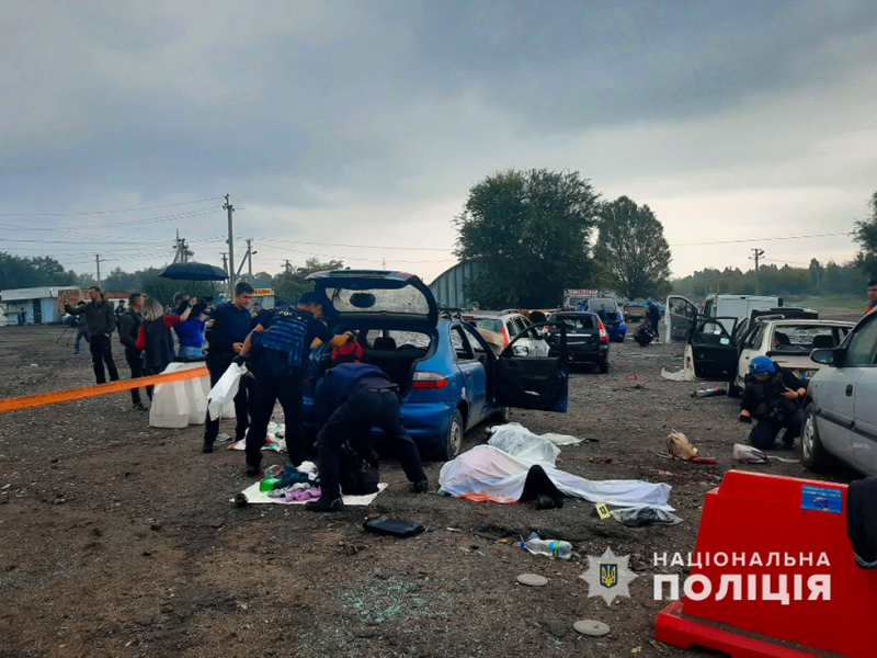 На цей час встановлено інформацію щодо 25 загиблих, з них – двоє дітей. Також від отриманих осколкових поранень на місці трагедії загинув співробітник поліції, який виконував службові обов’язки на пропускному пункті. Ще десятки людей госпіталізовані до медичних закладів міста, серед них – трирічна дівчинка.
