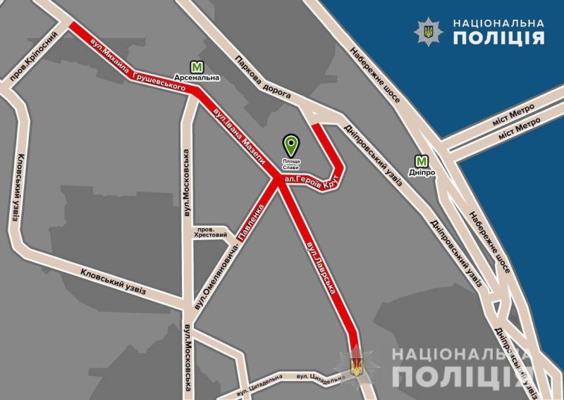 Починаючи з 5-ї години ранку 9 травня, поліцейські у Києві перекриватимуть рух наземного транспорту. Зокрема, рух перекриють на вулиці М. Грушевського (від провулку Кріпосного до вулиці Арсенальної), провулку Інженерному, вулиці Московській (від Кловського узвозу до площі Арсенальної), вулиці І. Мазепи (від площі Арсенальної до вулиці Лаврської), провулку Бутишів, вулиці М. Омеляновича-Павленка, алеї Героїв Крут, вулиці Лаврській (від вулиці І. Мазепи до вулиці Цитадельної).