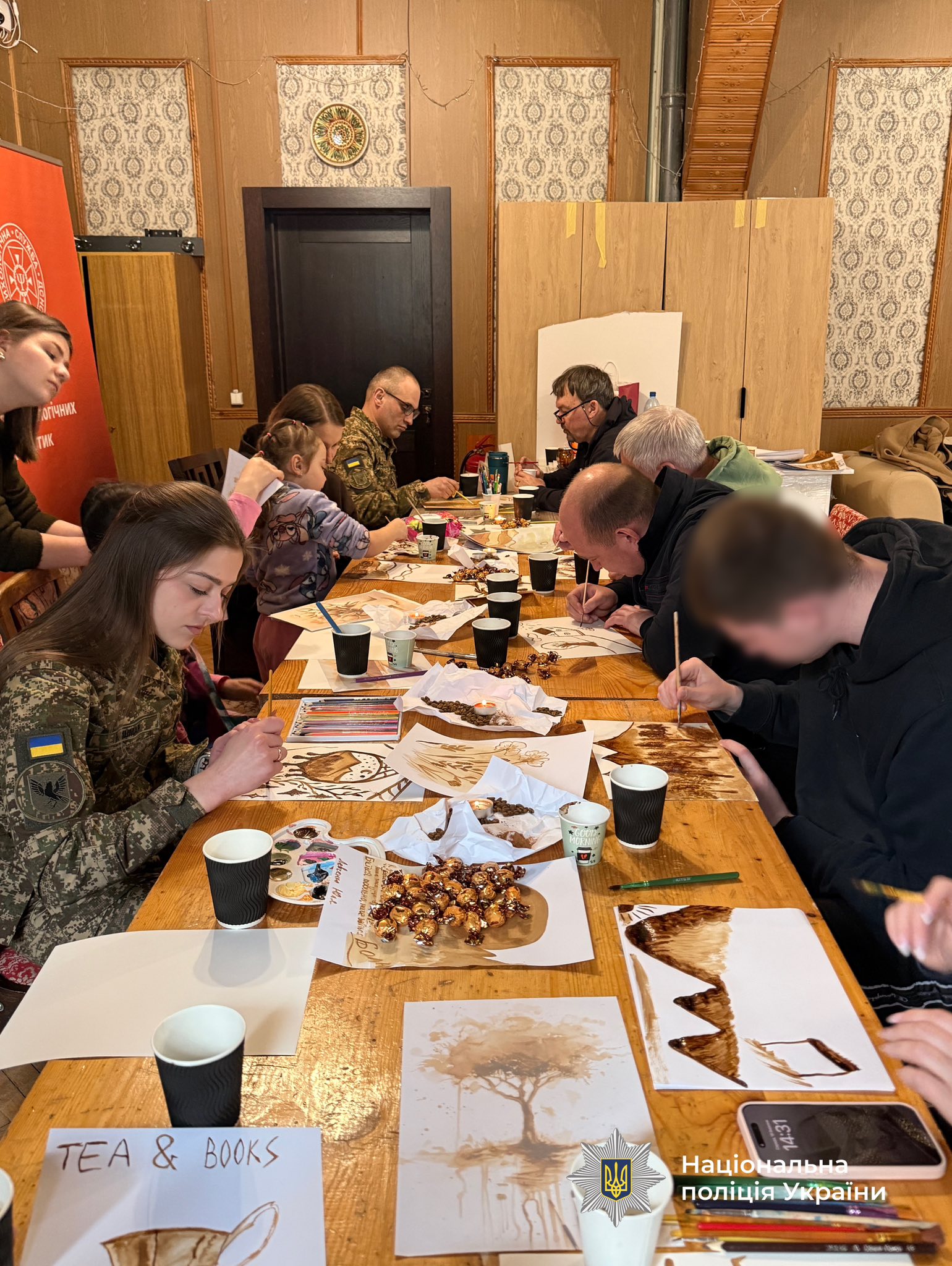 Невелика зала наповнена ароматом кави. Лунає тиха музика, на столах — свічки, поруч горнятка з теплим напоєм і солодощі. Усе це — не випадково. Так психологи формують відчуття безпеки та спокою. І саме в такій атмосфері захисники створюють картини у м’яких кремових і глибоких каштанових відтінках.