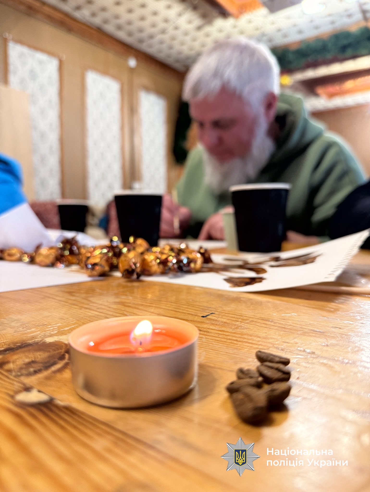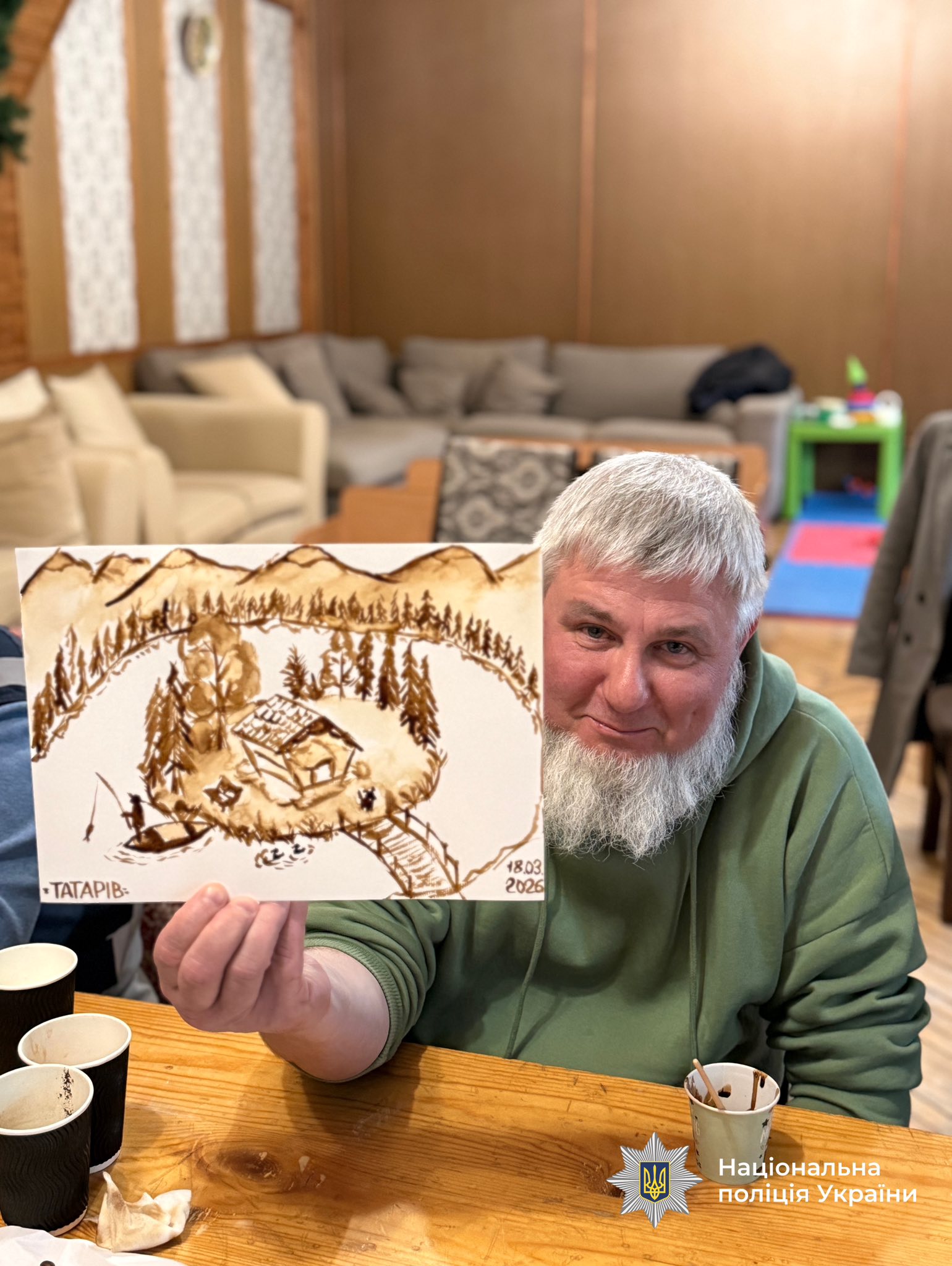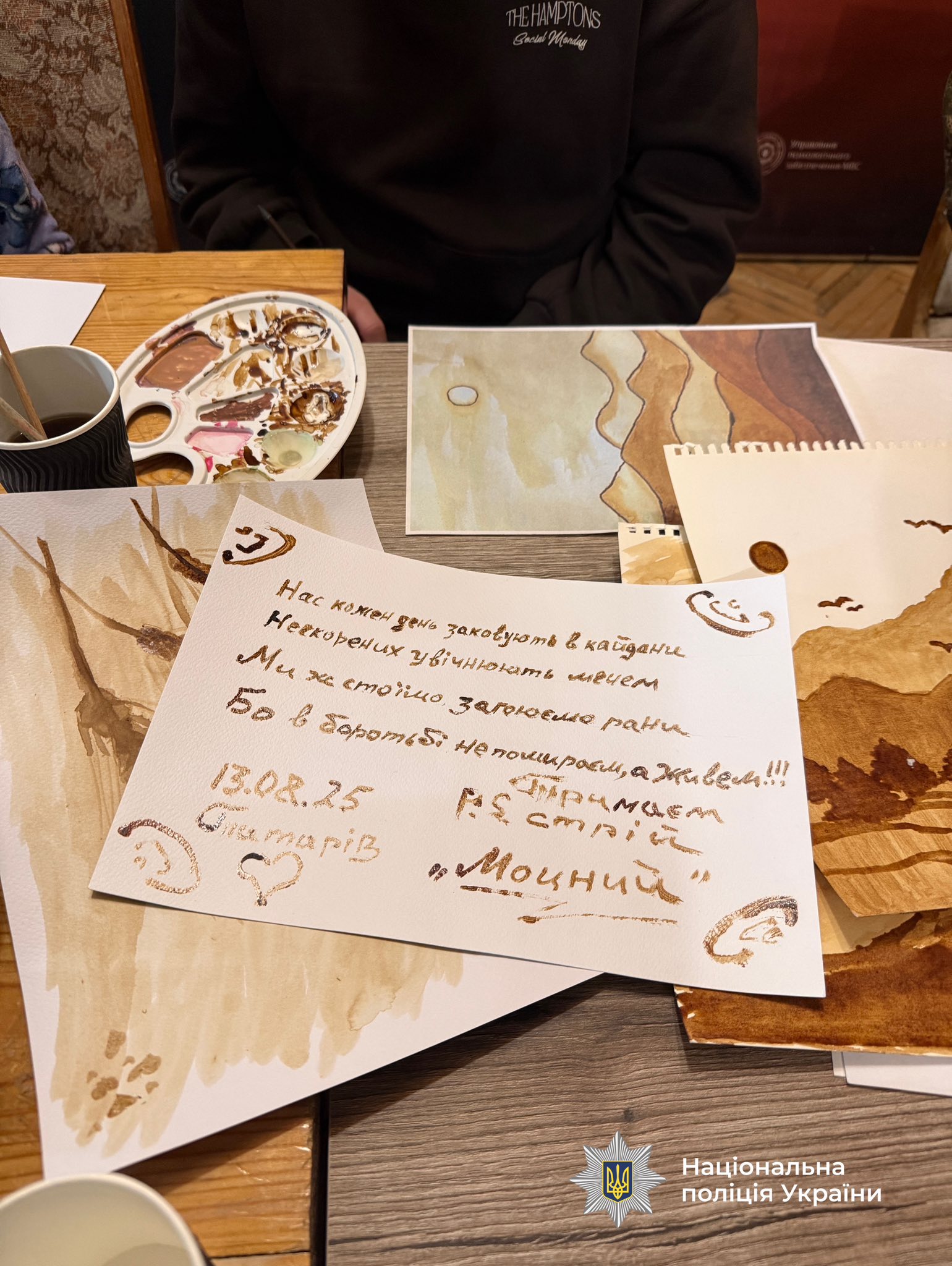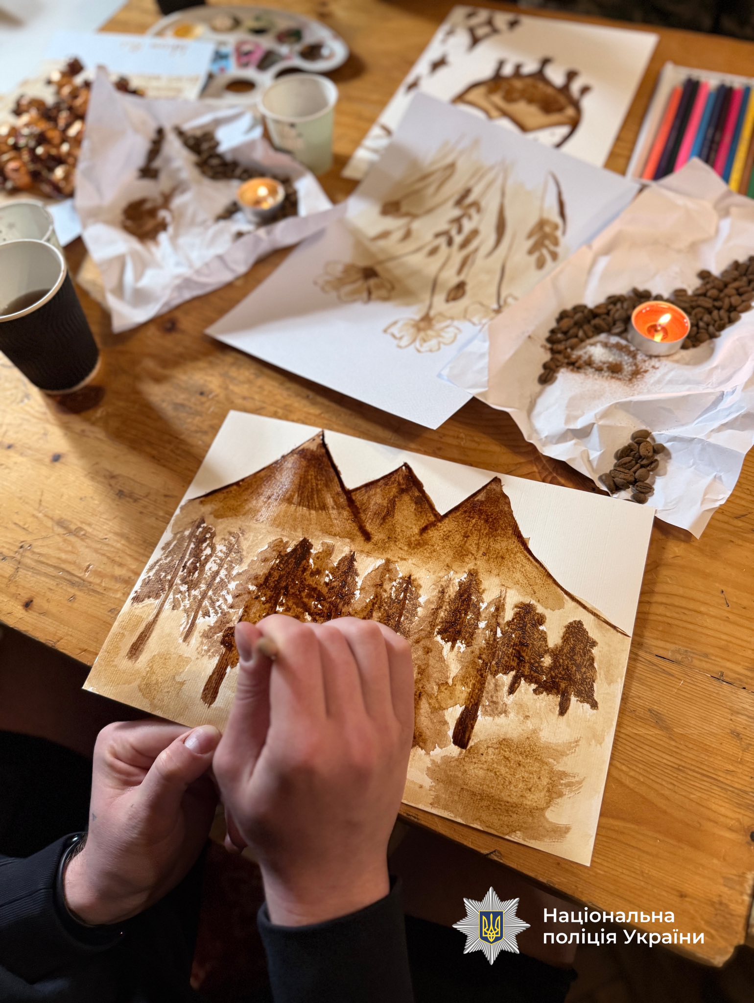 Серед учасників — слідчі Олександр Куценко та Микола Лисенко з Новгород-Сіверська Чернігівської області. Їхня служба проходить за кілька десятків кілометрів від кордону — під постійними обстрілами і тривогами. Поранення вони отримали, коли в будівлю, де перебували правоохоронці, влучили ворожі дрони. На кавотерапії кожен обирав свій сюжет. Олександр відтворив пейзажі Карпат, які побачив уперше.