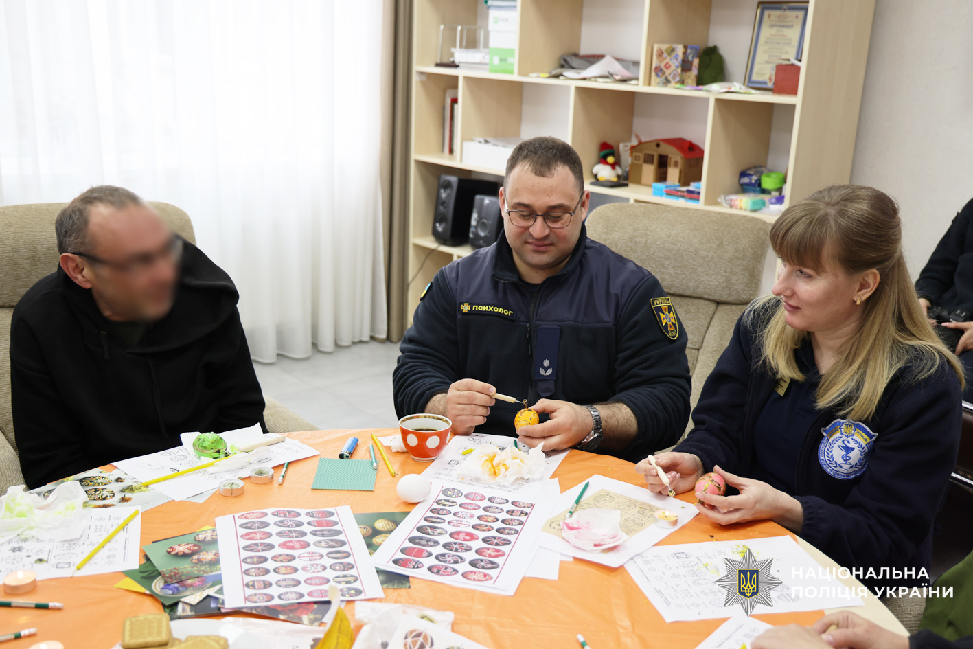 Фахівці психологічної служби поліції Чернігівської області спільно з колегами з Державної служби з надзвичайних ситуацій України та ДУ «ТМО МВС України по Чернігівській області» провели для поранених творчий майстер-клас з розмальовки великодніх крашанок. Такий формат роботи обрали невипадково: арт-терапія є одним із ефективних методів психологічної підтримки, що допомагає зняти напруження, переключити увагу, відновити внутрішню рівновагу та подарувати позитивні емоції.