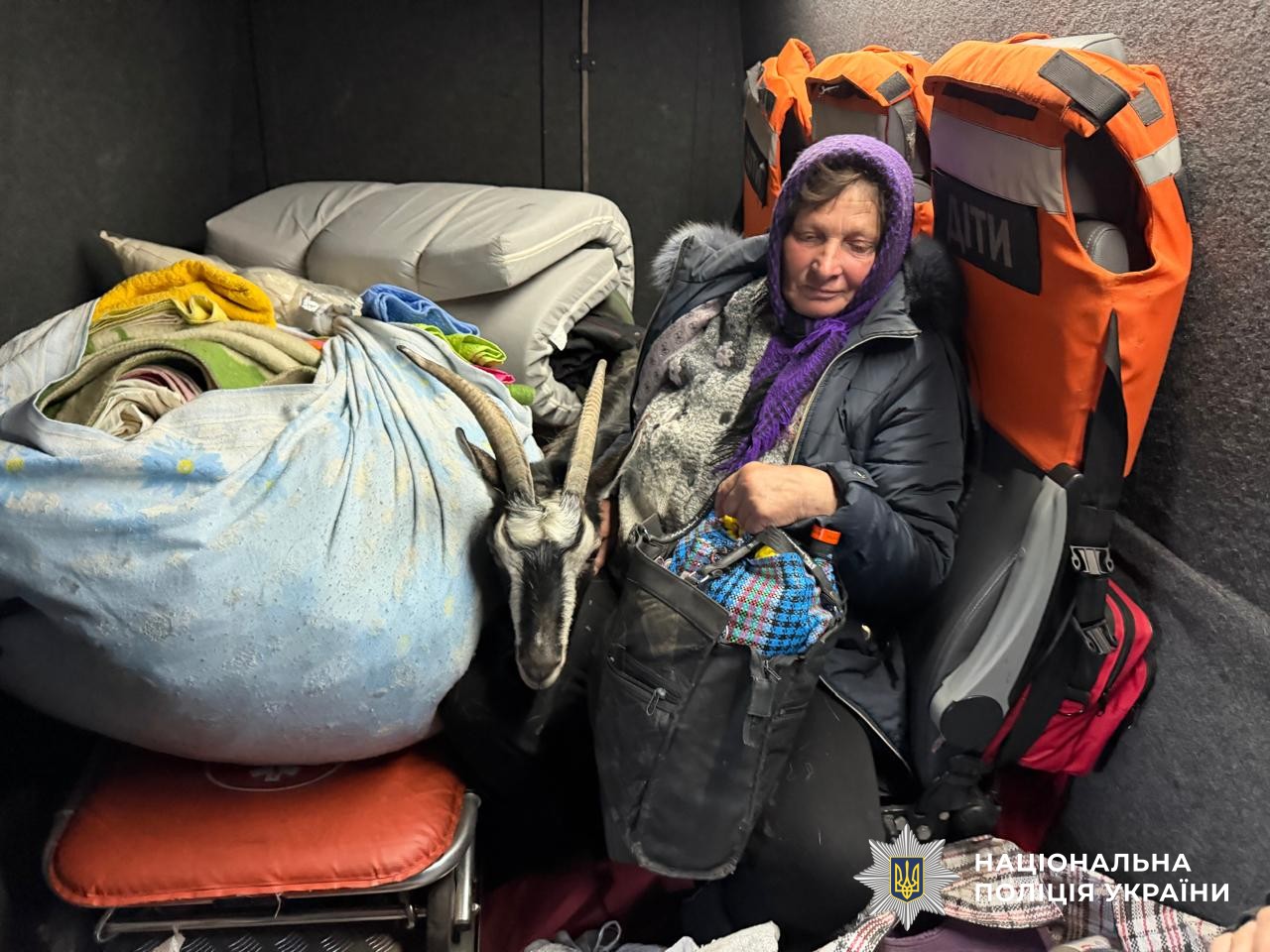 Наступною точкою стала Великописарівська громада. Тут поліцейські вивезли 67-річну Олену Іванівну разом із її козою — жінка не погоджувалась залишити тварину, яка для неї є частиною родини.