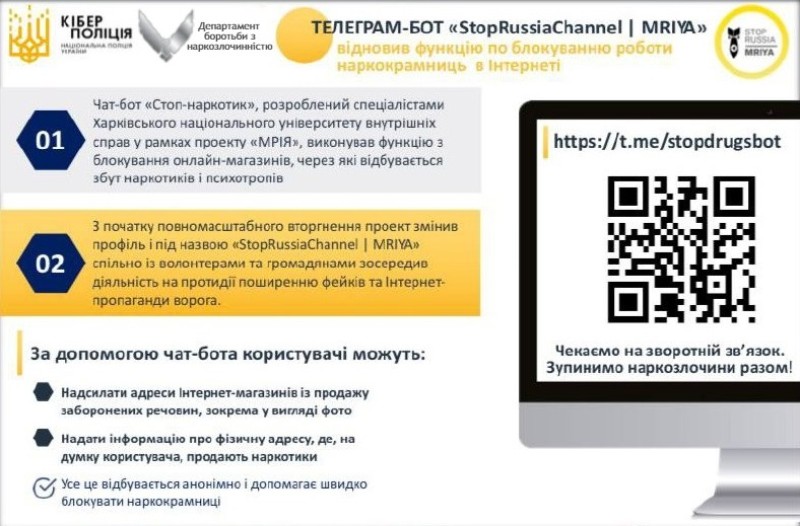 Чат-бот «StopRussiaChannel | MRIYA» відновив функцію з блокування роботи наркокрамниць в Інтернеті