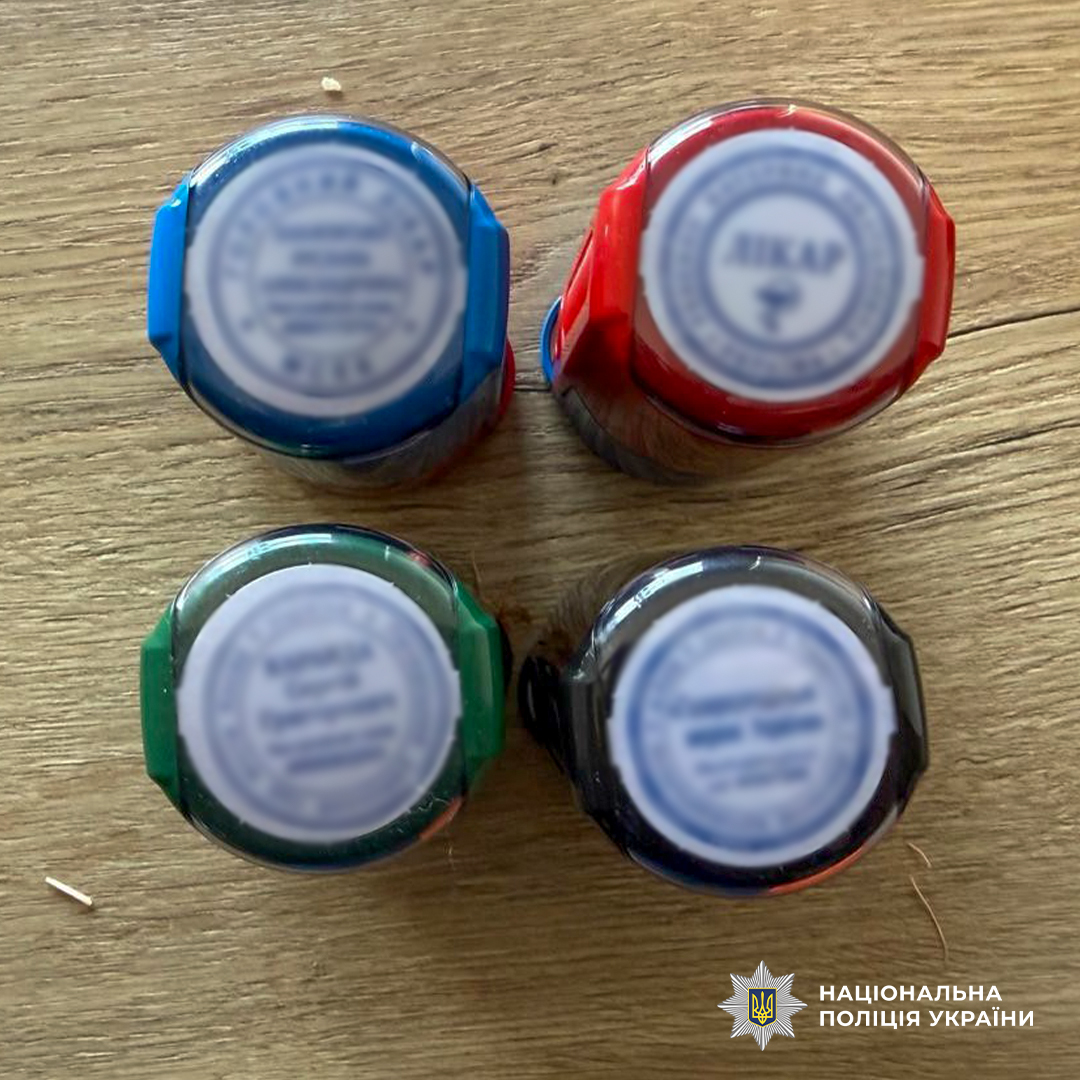 За результатами проведення обшуків у фігуранти виявили та вилучили печатки медустанов та лікарів, копії документів, зокрема й медичних, комп’ютерну техніку та гранату Ф-1.