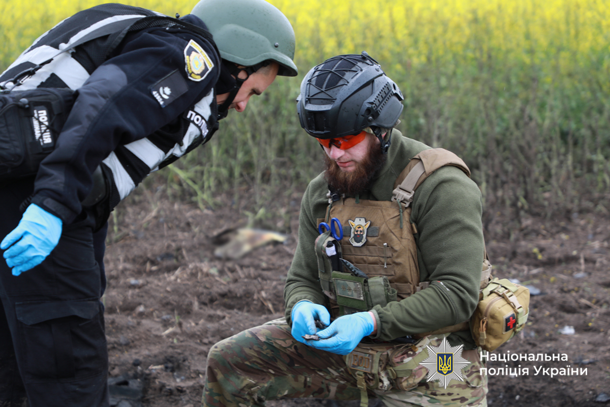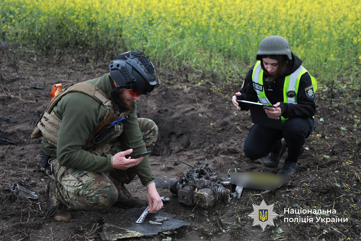 На місці працюють вибухотехніки поліції, які вилучили уламки безпілотника та бойову частину. Поліцейські продовжують ретельно обстежувати території на наявність вибухонебезпечних предметів.