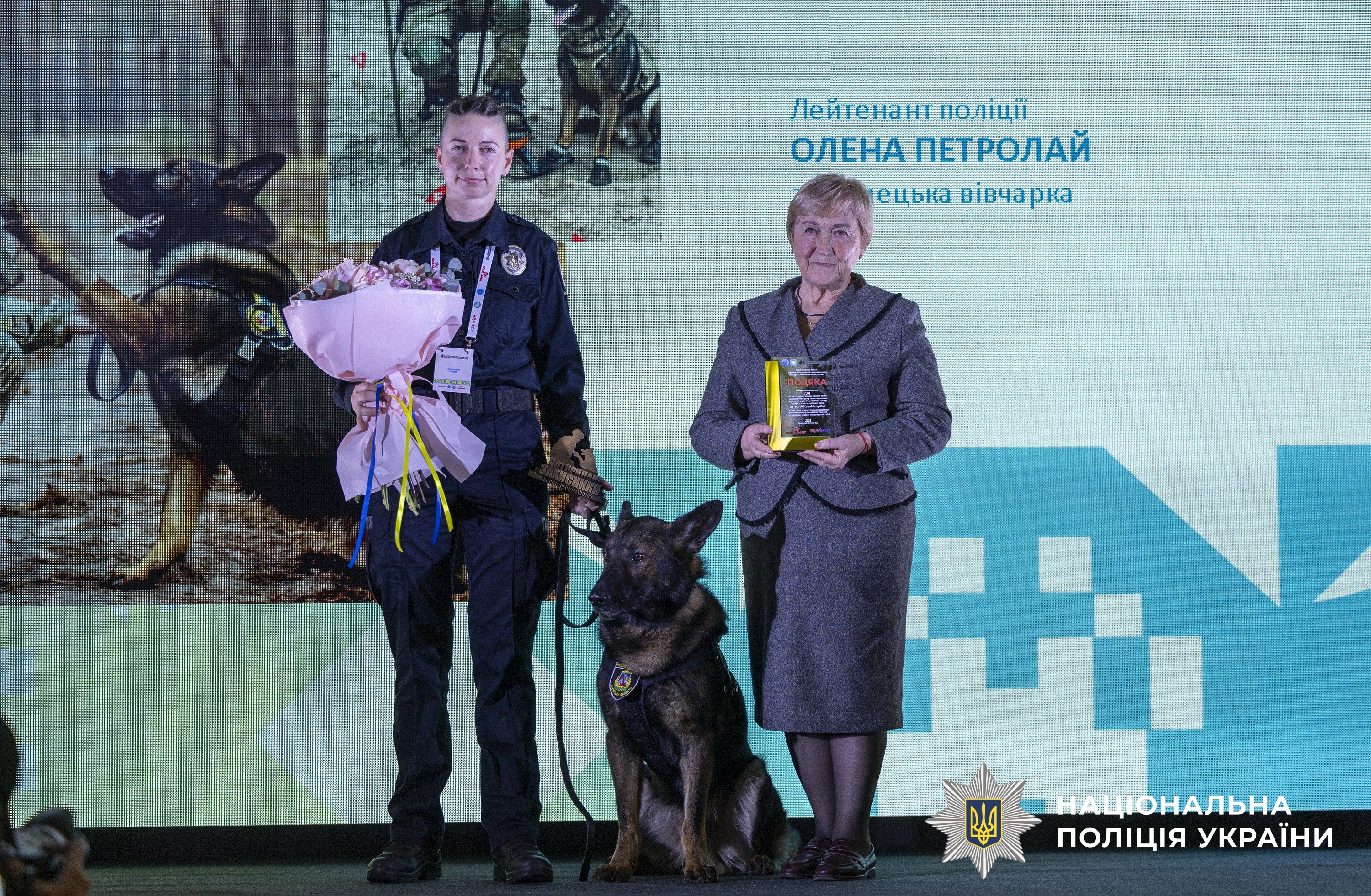 Переможці номінації «Пошук вибухових речовин» – інспектор-кінолог ГУНП у Київській області Олена Петролай та її напарник Пан. Олена – кавалер  ордену «За мужність» III ступеня.
