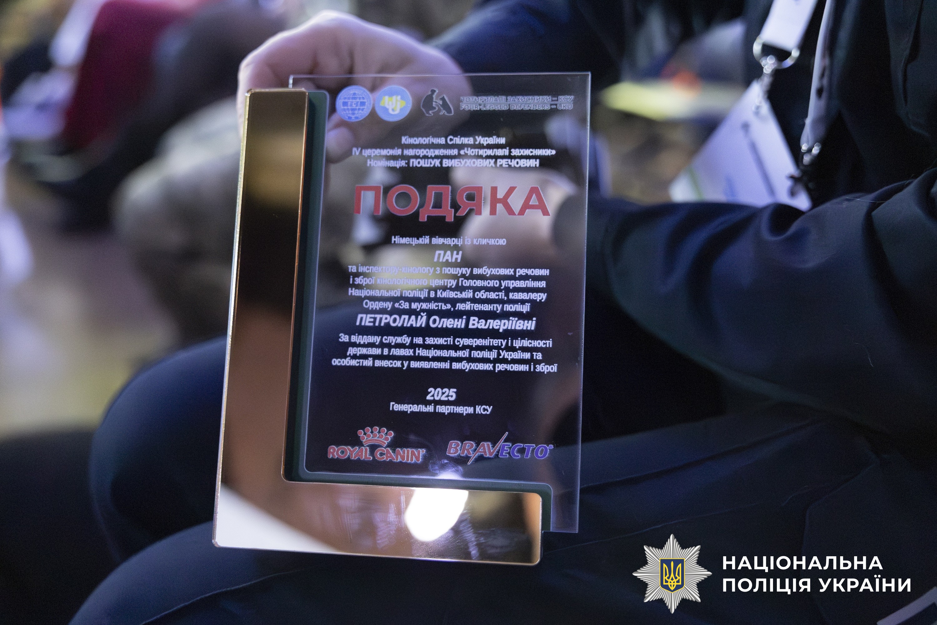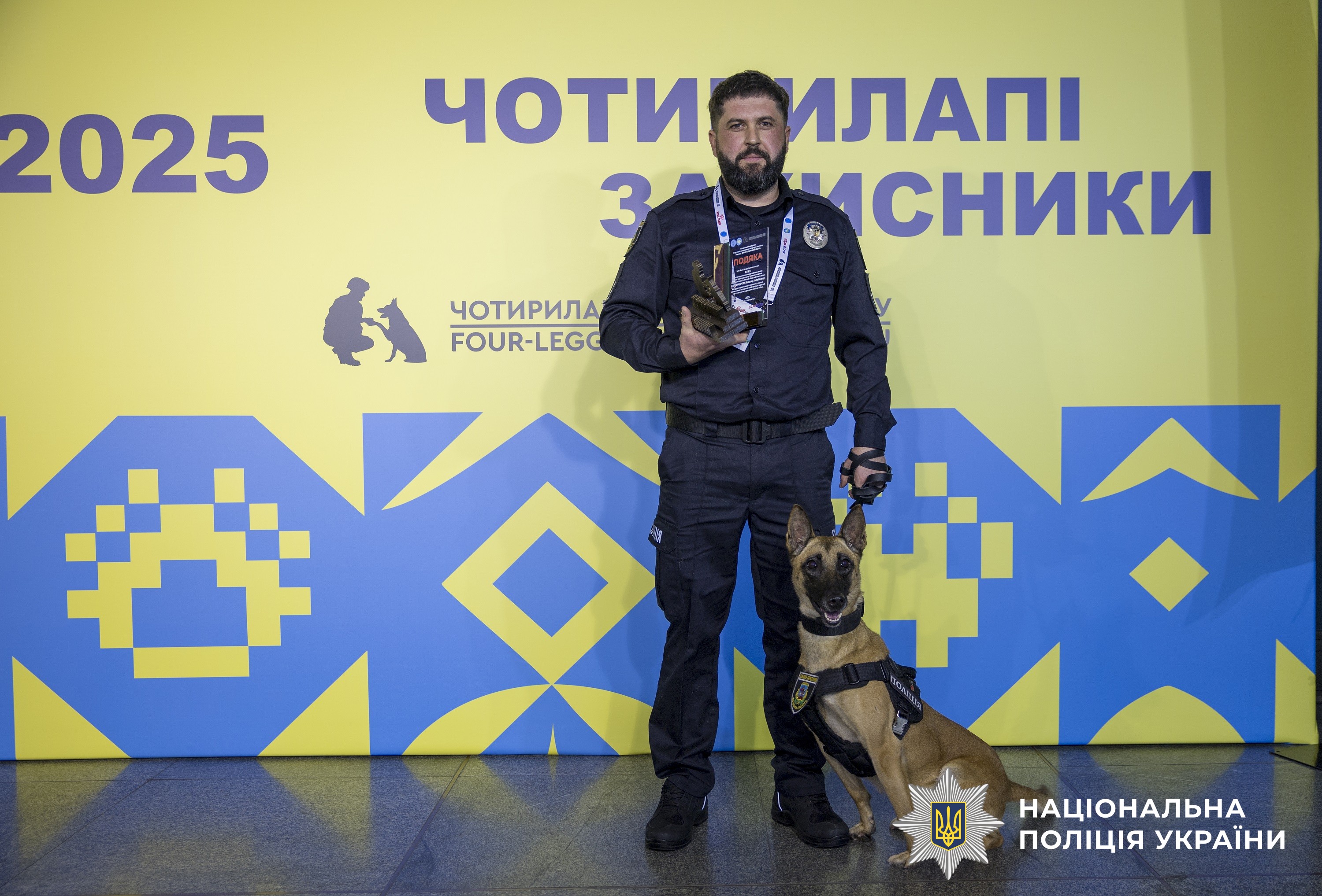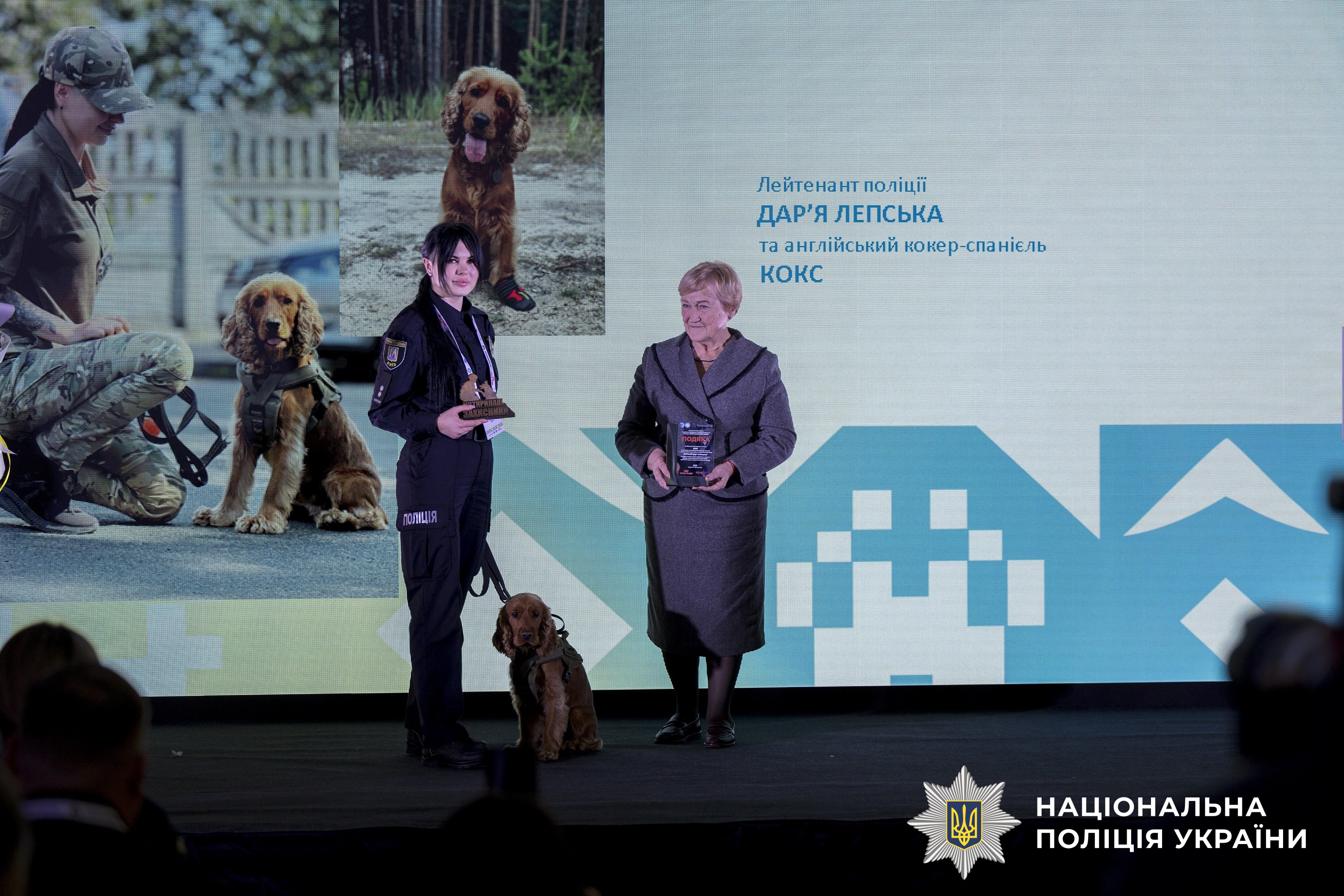 Інспектор-кінолог ГУНП у м. Києві лейтенант поліції Дар’я Лепська разом з англійським кокер-спанієлем Коксом отримали відзнаку у номінації «Пошук наркотичних засобів». Протягом 2025 року кінологиня та її вихованець 27 разів залучалися до проведення санкціонованих обшуків. Завдяки їхній спільній роботі у ретельно замаскованих схованках виявлено близько 10 кг наркотичних речовин.