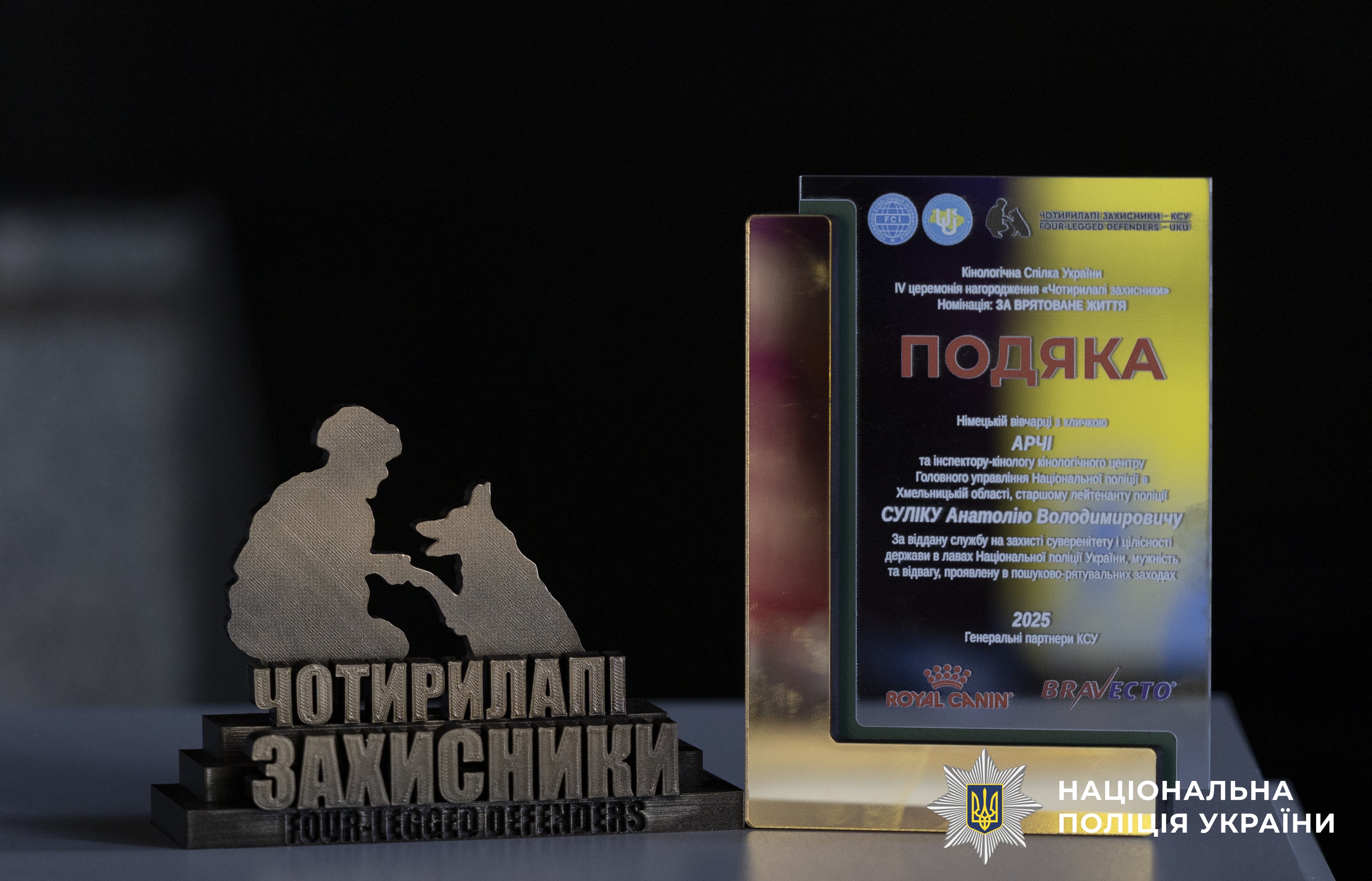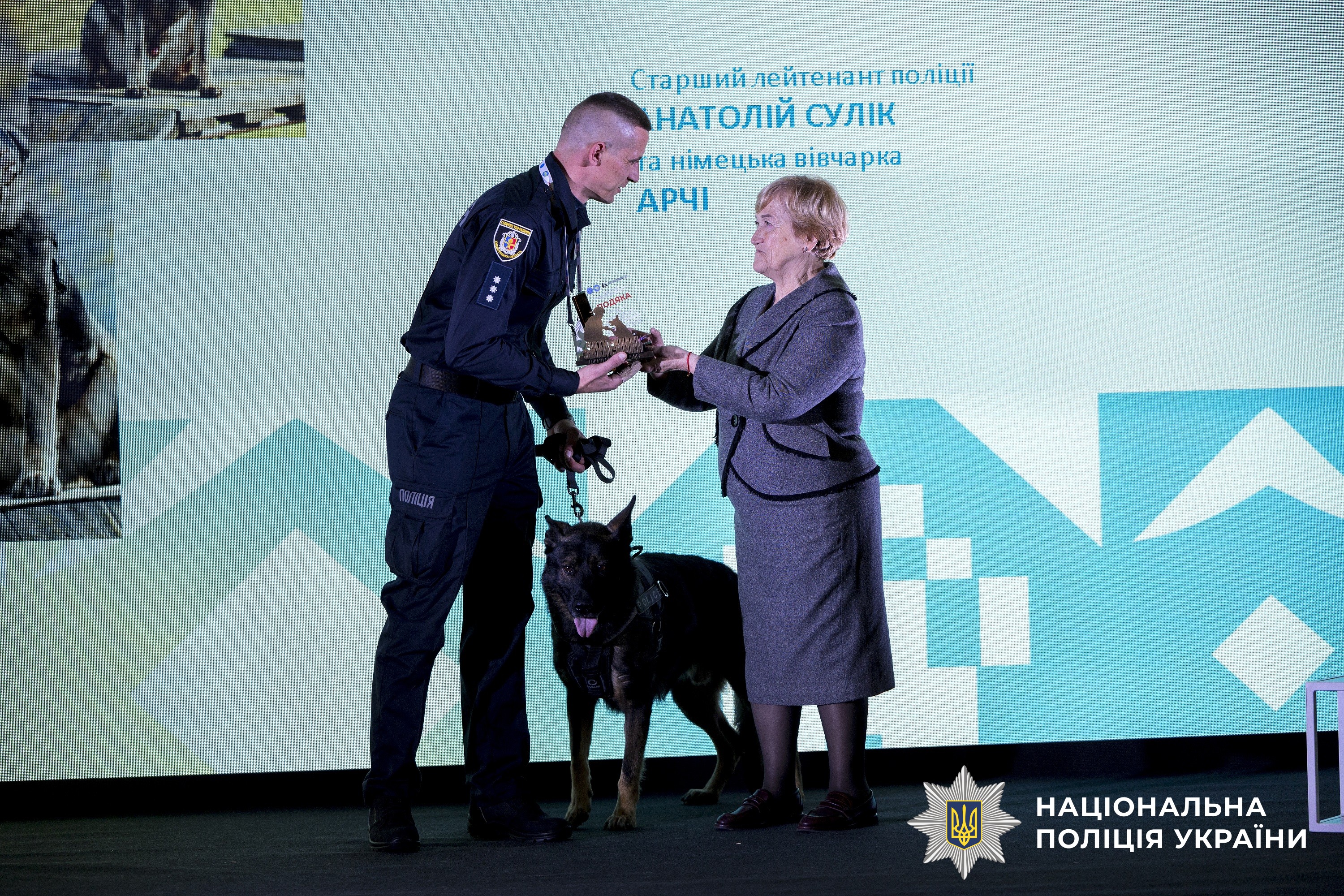 У номінації «За врятоване життя» нагороду отримали інспектор-кінолог ГУНП у Хмельницькій області Анатолій Сулік та його німецька вівчарка Арчі.