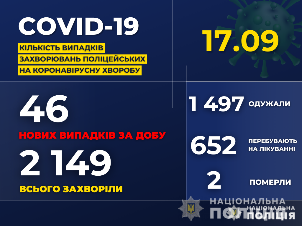Від початку пандемії на гостру респіраторну хворобу COVID-19 захворіли 2149 поліцейських, з них – 1 497 одужали.
