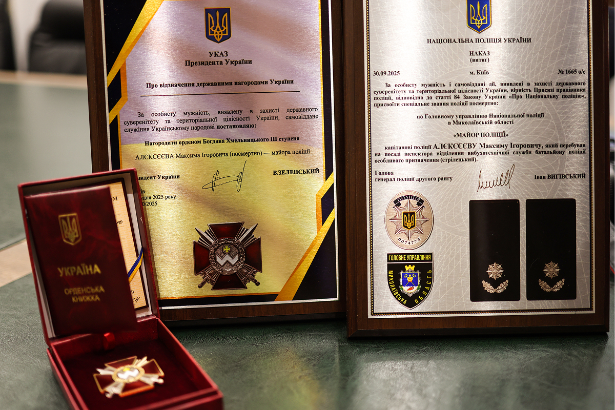 У грудні минулого року Президент України Володимир Зеленський підписав указ про посмертне відзначення державною нагородою з удостоєнням ордена «Богдана Хмельницького ІІІ ступеня» майору поліції Максиму Алєксєєву.
