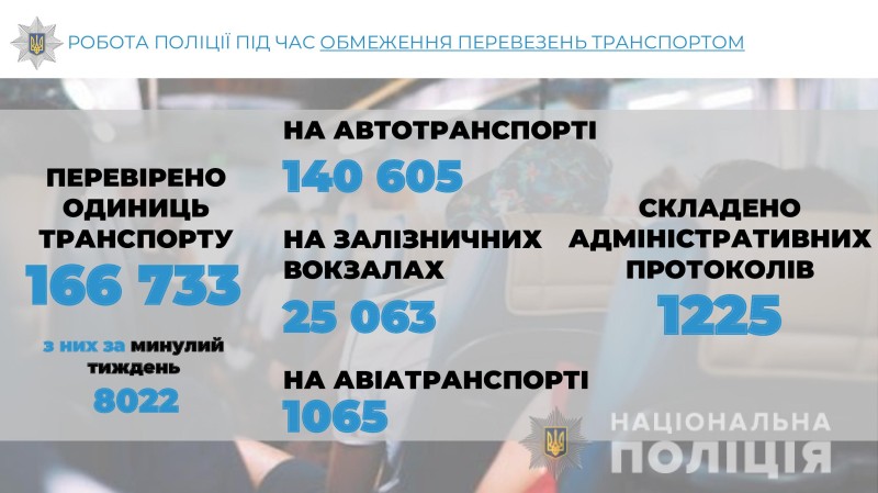 З 21 жовтня органи Національної поліції України здійснили перевірку понад 160 тисяч регулярних та нерегулярних пасажирських перевезень. З них понад 8 тисяч – за минулий тиждень. Зокрема звертали увагу на наявність у водіїв, пасажирів, екіпажів авіатранспорту документів про вакцинацію, відповідного сертифіката або негативного результату тестування на COVID-19 методом ПЛР чи експрес-тесту на визначення антигену.