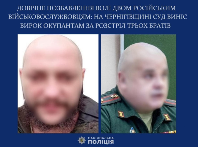 Чернігівський районний суд завершив розгляд матеріалів кримінального провадження щодо розстрілу російськими окупантами трьох братів, вчиненого у березні 2022 року. Двоє братів загинули на місці, а третій дивом вижив і вибрався з могили. Згідно з вироком суду, обидва фігуранти – військові окупаційного контингенту армії рф – засуджені до довічного позбавлення волі.