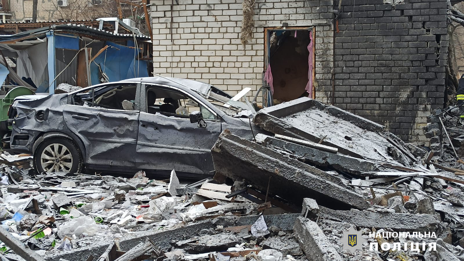 Зруйнована цивільна інфраструктура: багатоквартирні житлові будинки та навчальний заклад. Пошкоджені автомобілі.