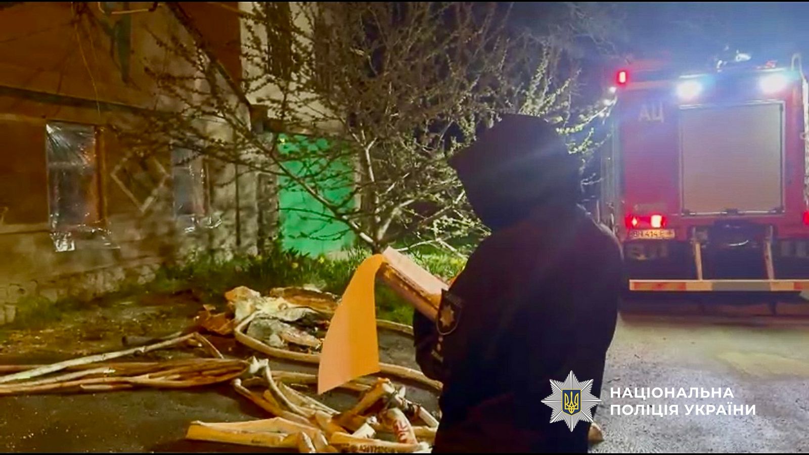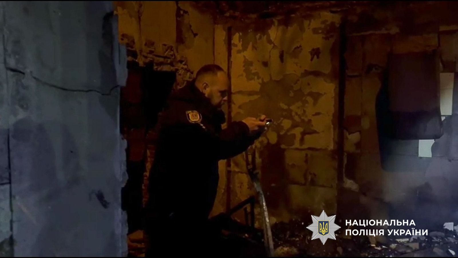 Поліцейські фіксують наслідки нічної атаки, збирають докази, опитують людей, надають психологічну допомогу та забезпечують правопорядок.