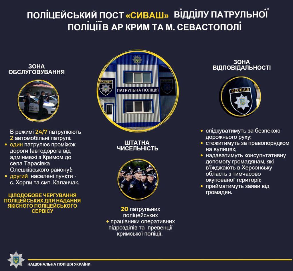 Окрім 20 патрульних поліцейських, які забезпечуватимуть безпеку на автодорозі від адмінмежі з Кримом до села Тарасівка Олешківського району, на посту нестимуть службу також працівники оперативних підрозділів та превенції кримської поліції. Вони надаватимуть весь комплекс поліцейських послуг, захищатимуть права кримчан, надаватимуть консультативну допомогу громадянам, які в’їжджають в Херсонську область з тимчасово окупованої території. Також, на посту «Сиваш» жителі півострова зможуть подавати заяви про злочини та правопорушення, вчинені стосовно них.