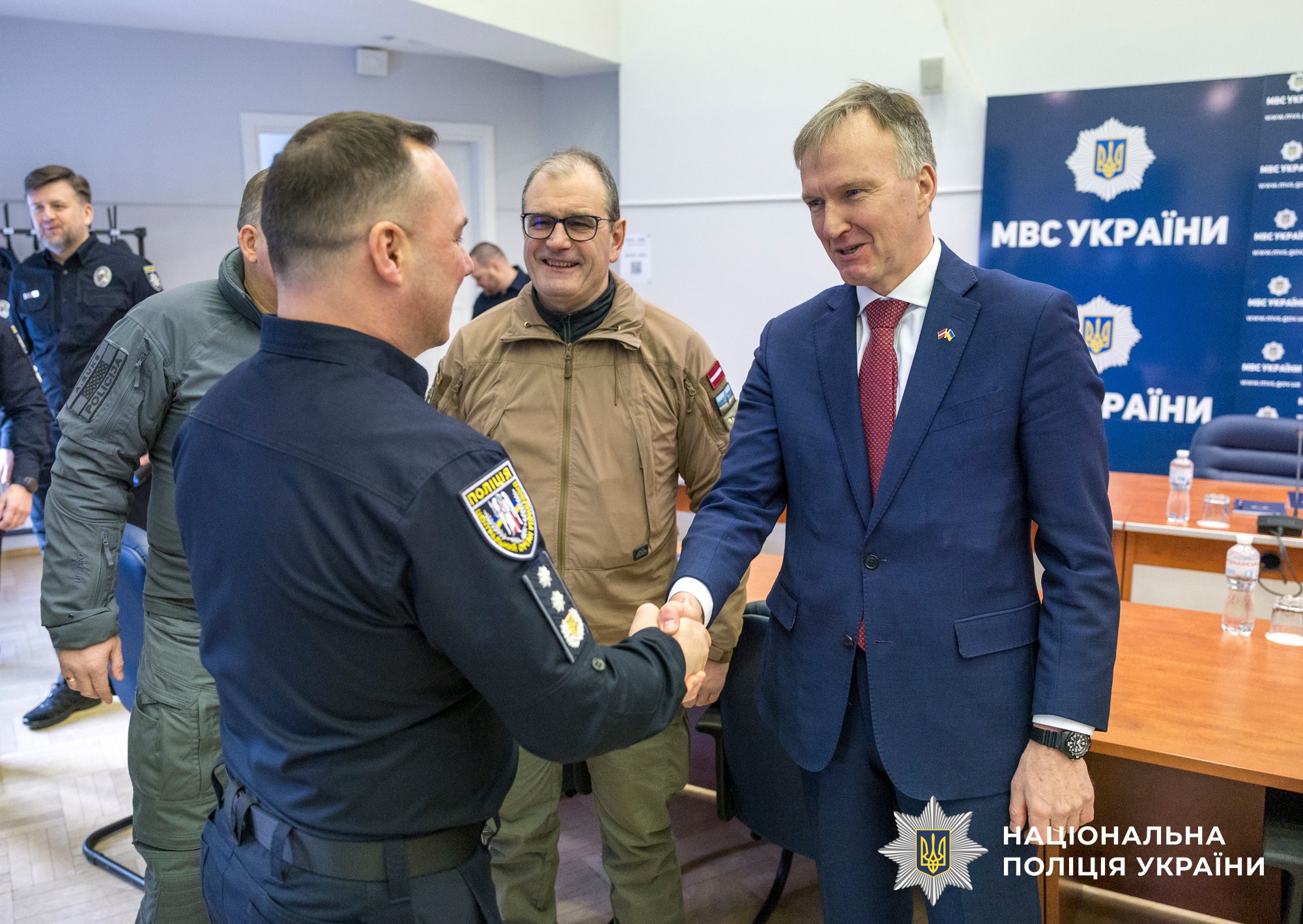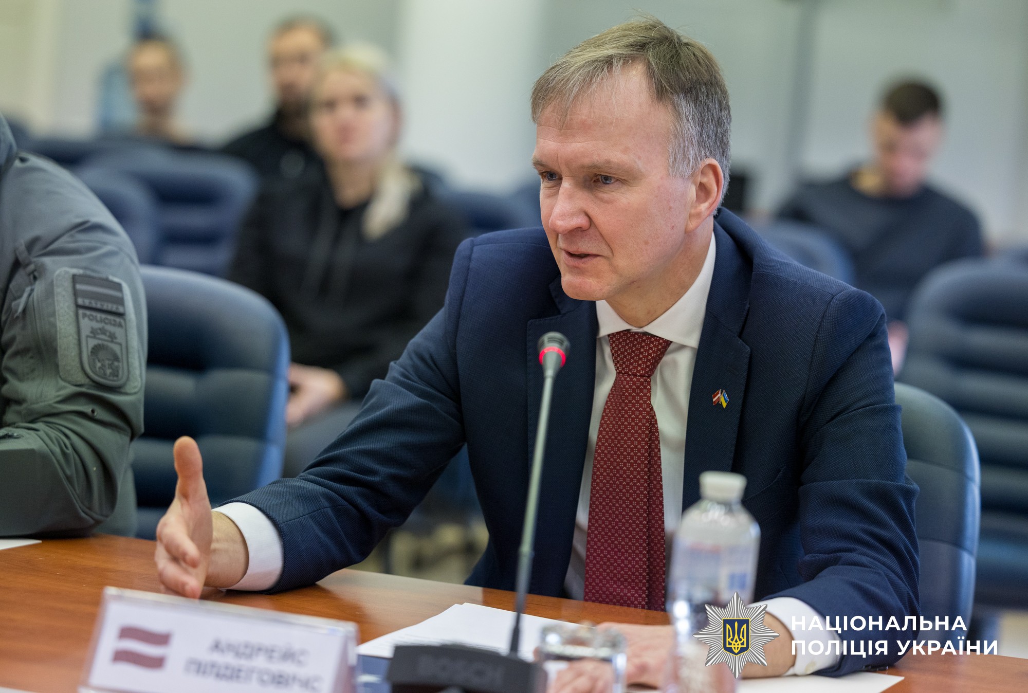 Слова підтримки висловив і Надзвичайний і Повноважний Посол Латвійської Республіки в Україні Андрейс Пілдеговічс. Він зазначив, не дивлячись на війну, робота Посольства розширюється, зокрема з’явилися експерти з воєнної індустрії, з питань економічної співпраці. Крім того, він подякував українським поліцейським за успішну співпрацю у напрямку організованої злочинності, викритті інтернет-шахрайств.