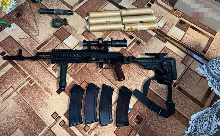 Під час проведення санкціонованих обшуків у фігуранта вилучено арсенал зброї та вибухонебезпечних предметів, серед яких автомати, гранати, гранатомети, тротил та окопні снаряди.