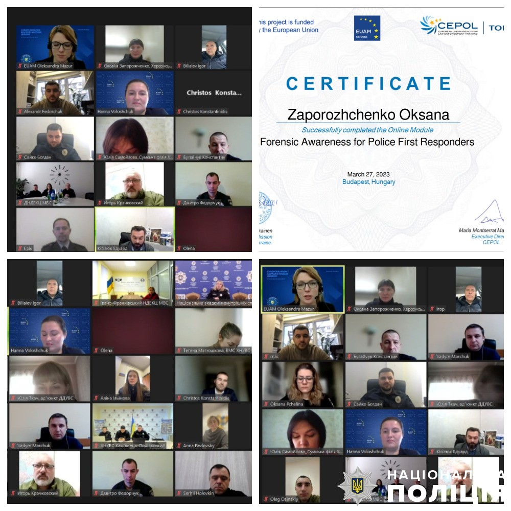 Під час проведення організованої КМЄС в Україні та CEPOL онлайн церемонії відзначення та нагородження перших 20 учасників, які успішно пройшли навчальні модулі на освітній онлайн-платформі CEPOL в межах проєкту TOPCOP, від Херсонської області сертифікат отримала Оксана Запорожченко.
