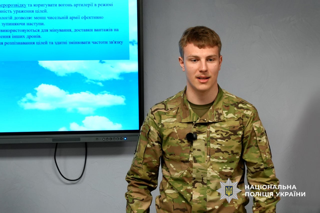 Оператор БПЛА стрілецького батальйону поліції детально розповів про роль дронів у сучасних боях, підготовку екіпажів та важливість технічної освіти для майбутніх військових і правоохоронців. Учні дізналися про участь бійців в евакуації цивільного населення та допомогу людям у зонах активних бойових дій.