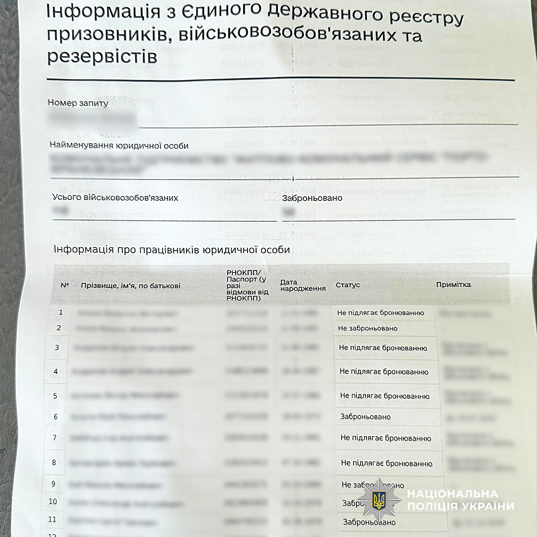 Ще одним джерелом незаконного збагачення злочинної групи була схема щодо військовозобов’язаних: через формальне оформлення на підприємстві критичної інфраструктури їм надавали відстрочку від служби в ЗСУ. Поліцейські встановили 13 випадків такого фіктивного бронювання.