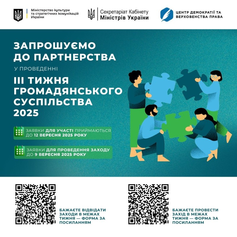 Тиждень громадянського суспільства проводитиметься в межах реалізації Національної стратегії cприяння розвитку громадянського cycпільства в Українi та триватиме з 15 до 21 вересня 2025 року.