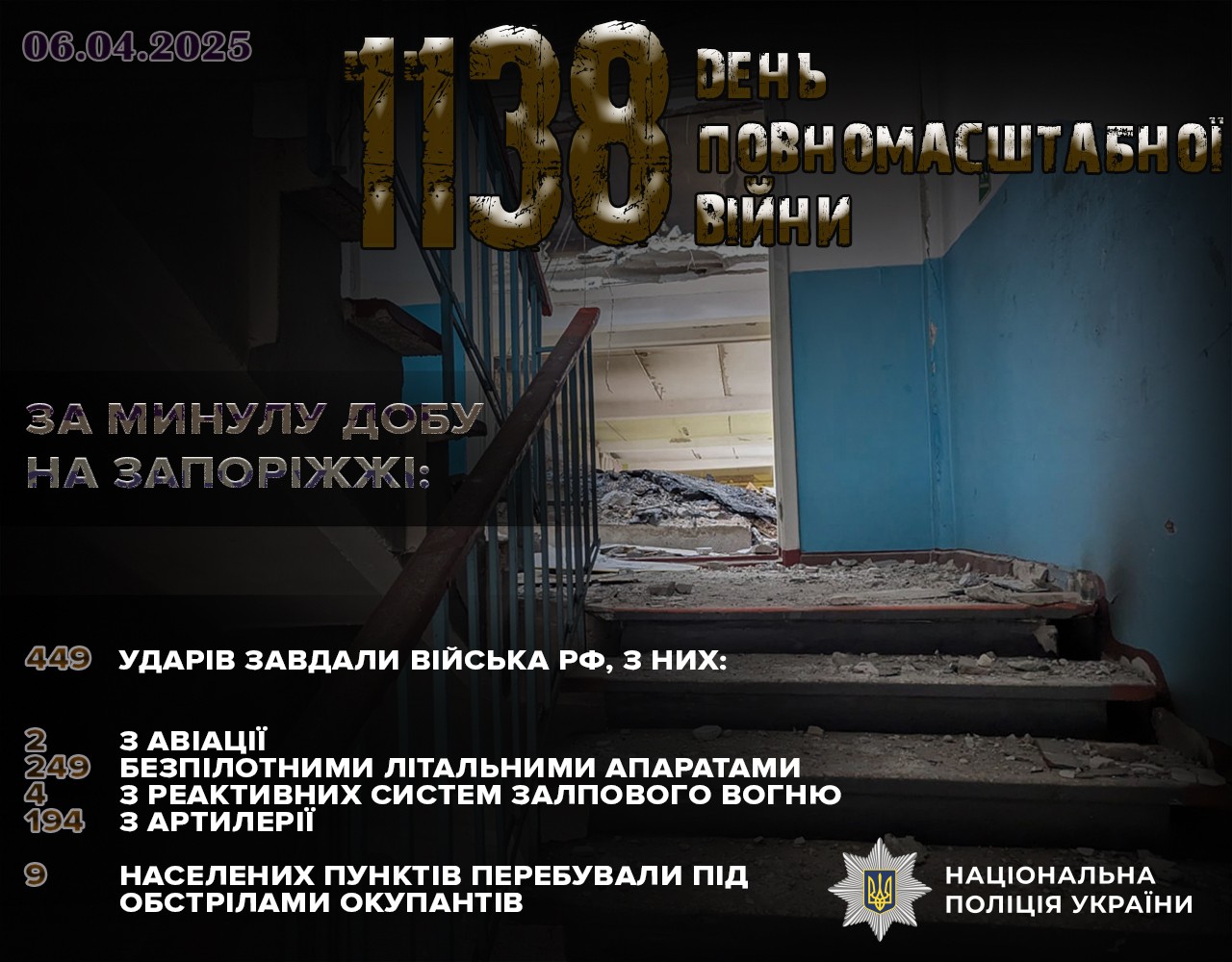 Нагадаємо: 497 ударів по населених пунктах Запорізької області за добу: слідчі поліції задокументували наслідки ворожих обстрілів.