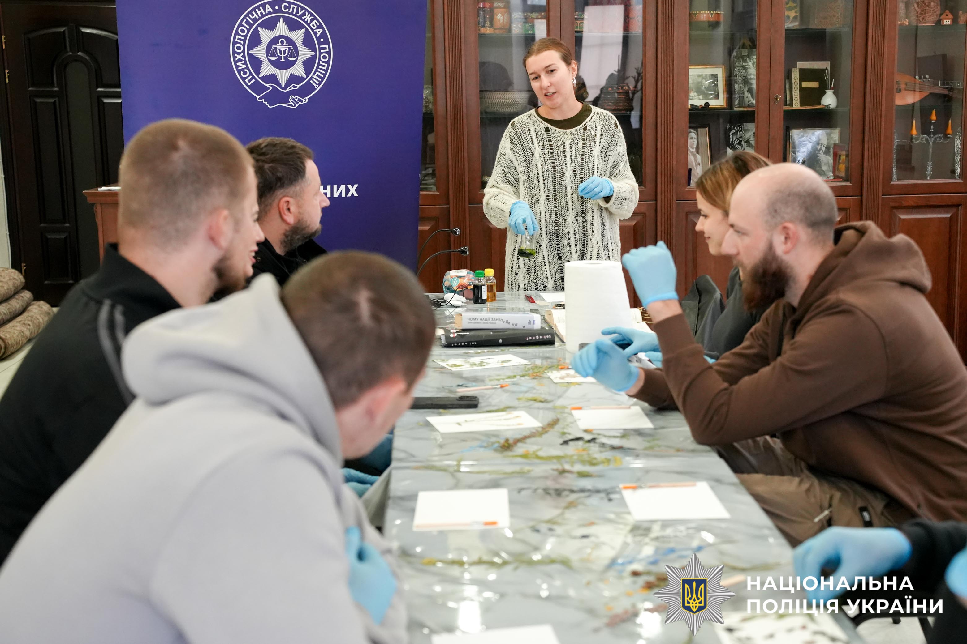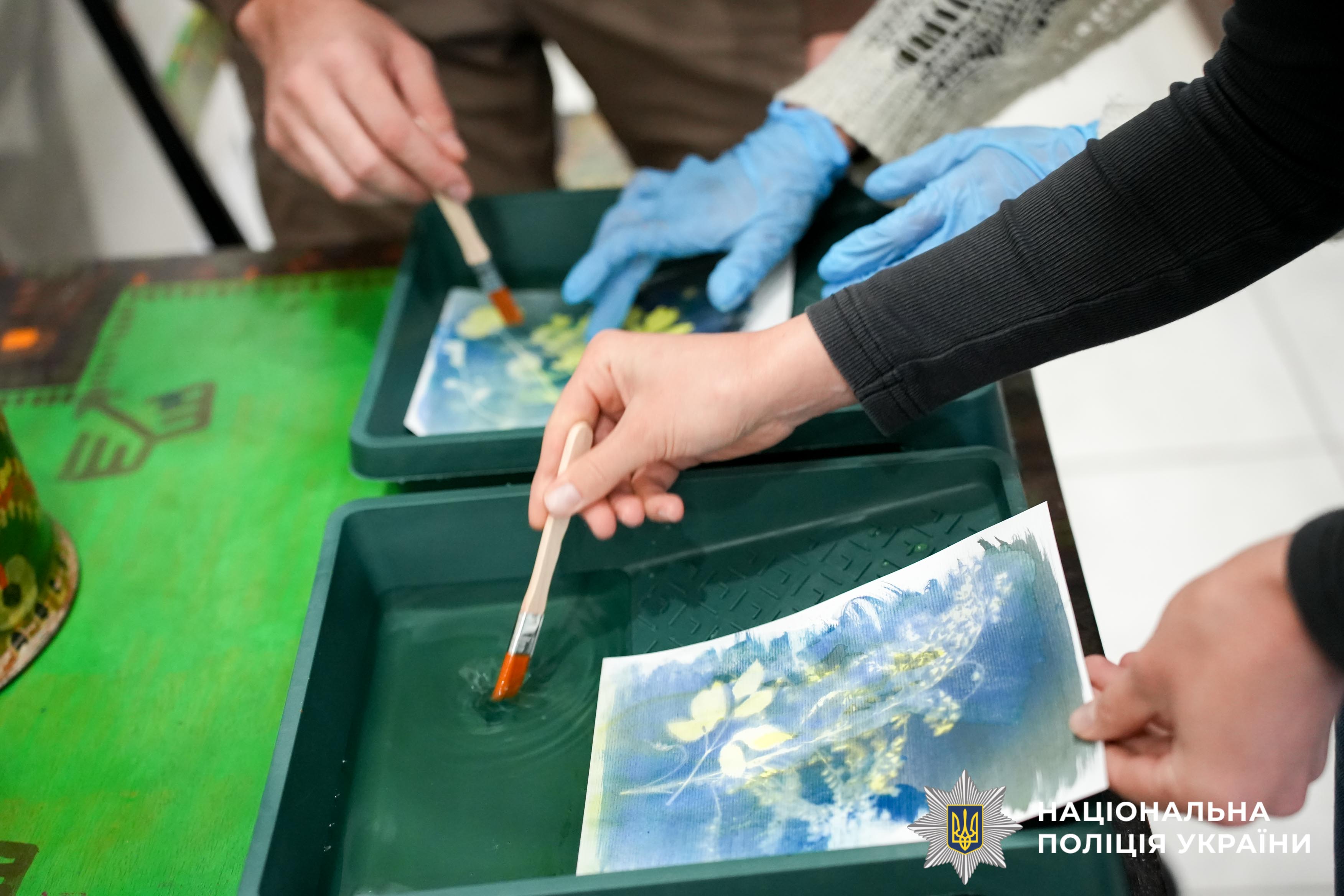 Психологи поліції Рівненщини спільно з фахівцем відомчої медичної установи організували для поранених захисників сеанс арттерапії у техніці ціанотипії — ніжного та водночас символічного мистецтва, де зображення народжуються зі світла, води й часу. У синіх відтінках відбитків оживали силуети листя, квітів і спогадів, наповнюючи простір особливим змістом — про стійкість, відродження й непохитність людського духу.