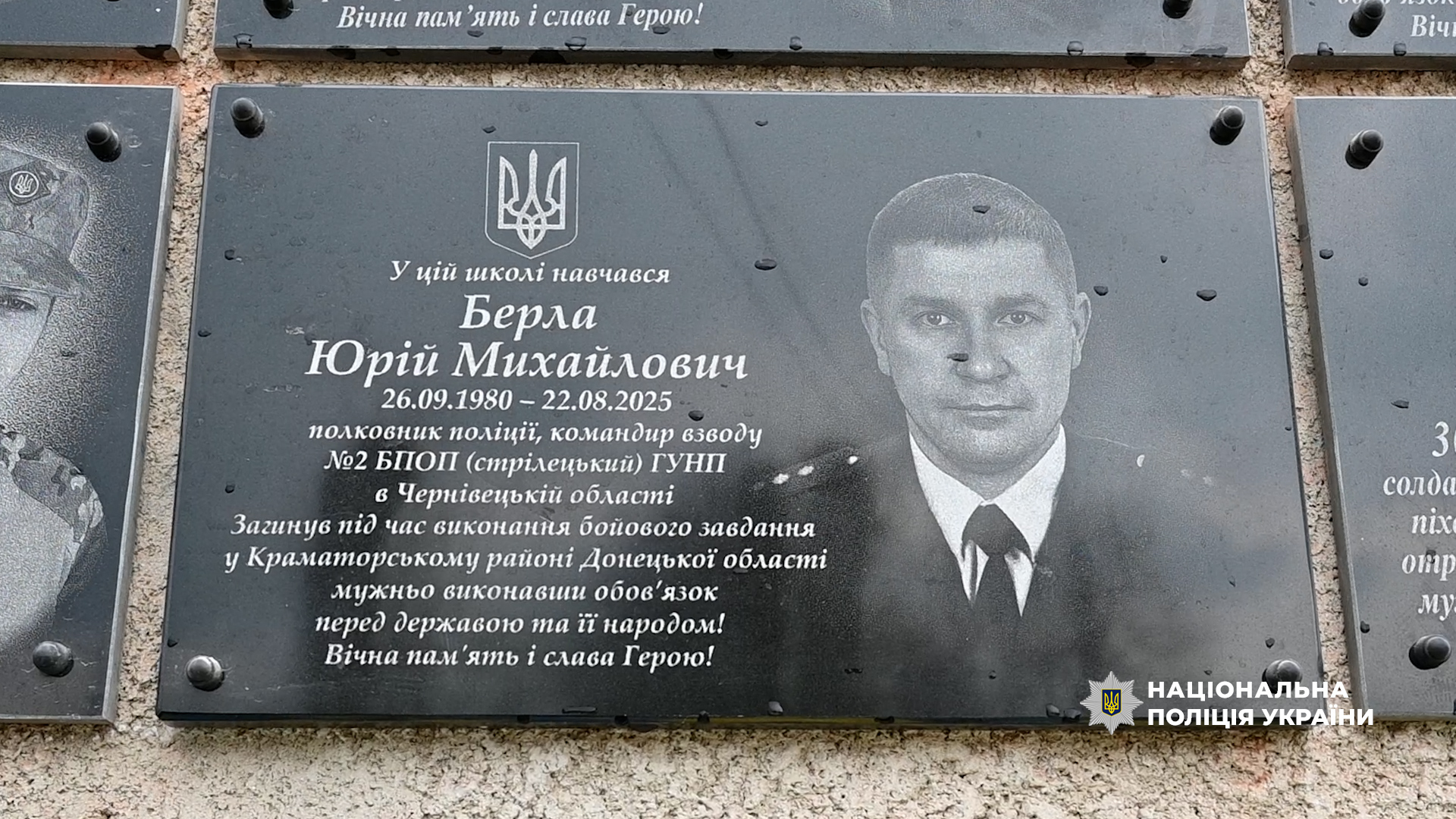 Відкрили пам’ятні стели для випускників ліцею на фасаді навчального закладу – як символ вдячності та шани за їхню мужність і самопожертву. Серед полеглих – буковинський поліцейський Юрій Берла, який із побратимами мужньо тримав оборону на Донецькому напрямку, захищаючи рідну землю від окупантів. На жаль, під час виконання бойового завдання Юрій Михайлович зазнав смертельних поранень.