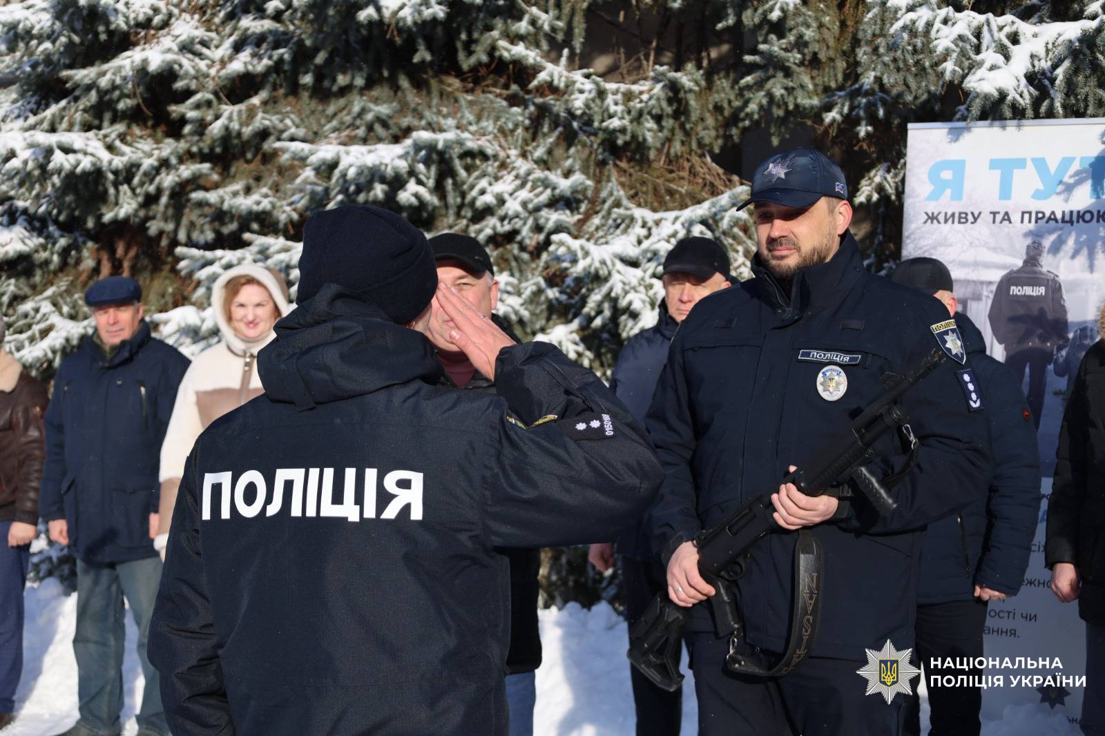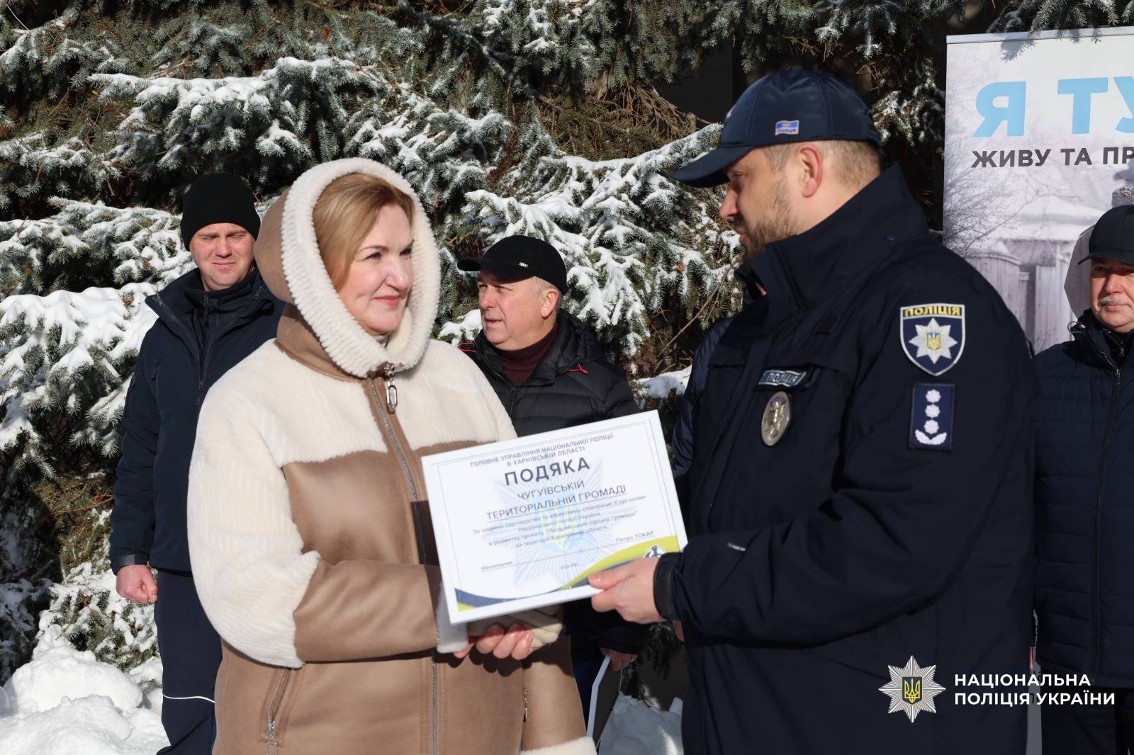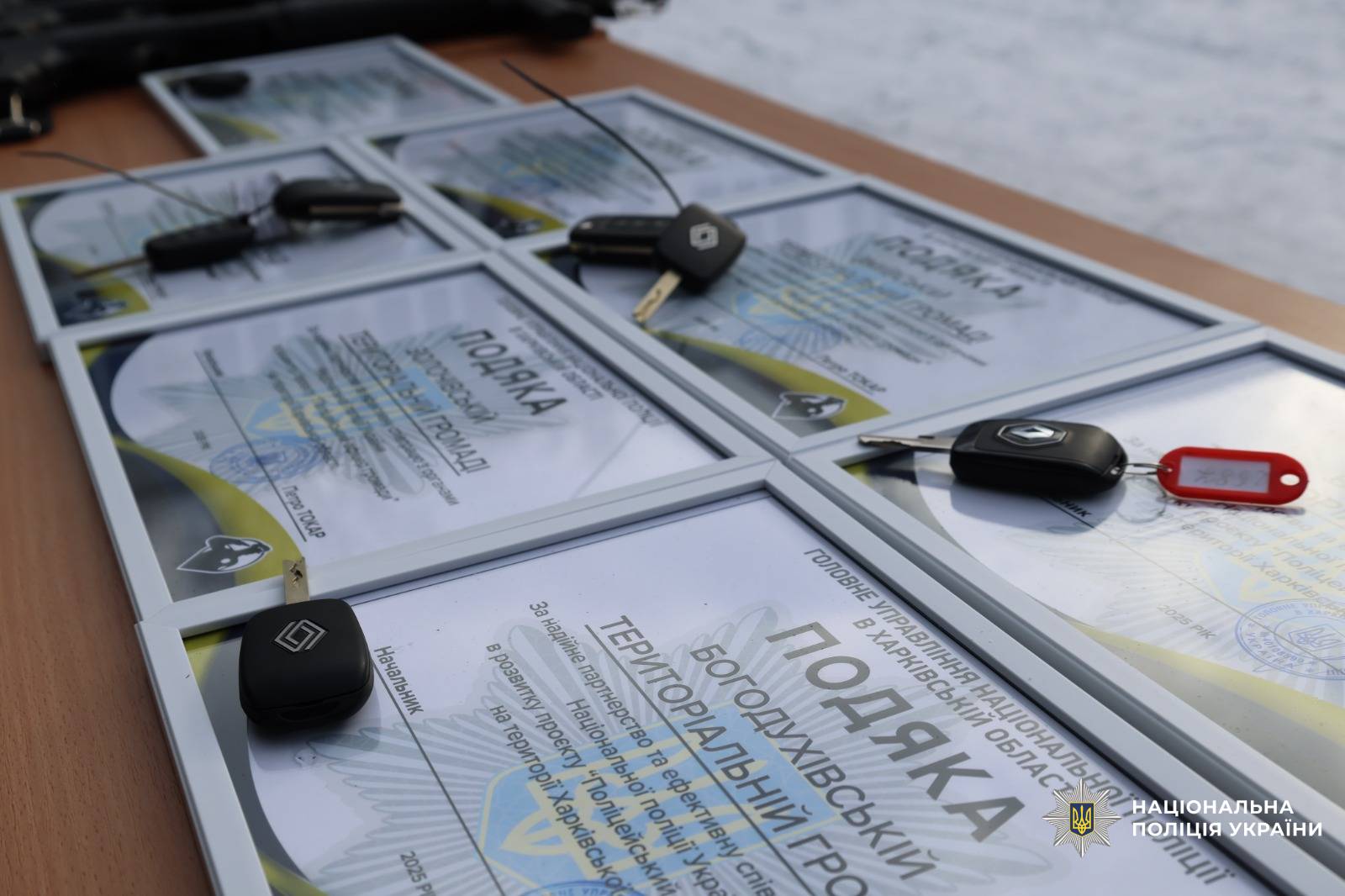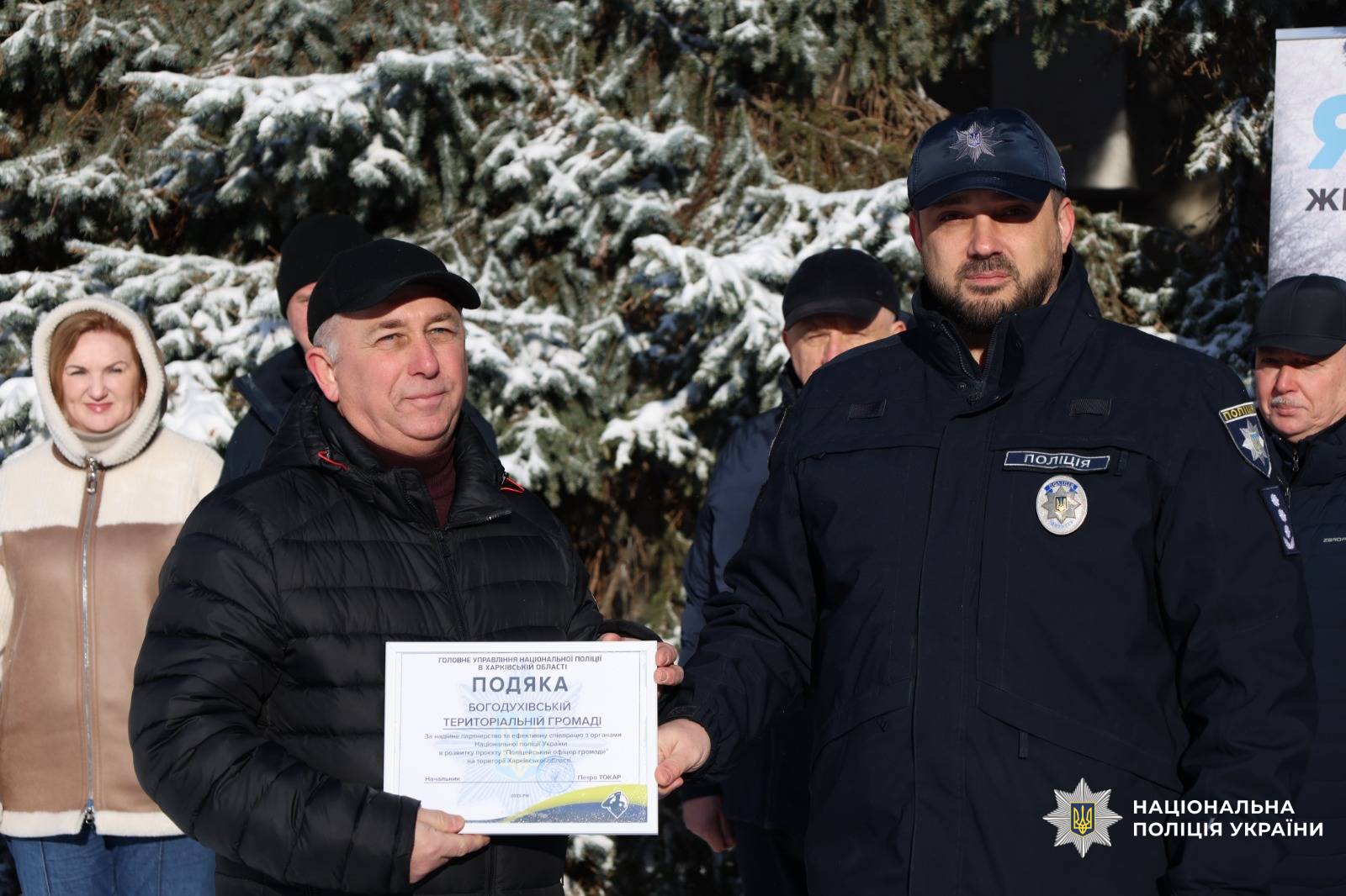 Керівники територіальних громад вручили поліцейським офіцерам ключі від службового автотранспорту. Службові автомобілі отримали поліцейські з семи територіальних громад Харківщини - Богодухівської, Валківської, Золочівської, Зміївської, Люботинської, Сахновщинської та Чугуївської. Очільник поліції Харківщини Петро Токар передав поліцейським помпові рушниці.