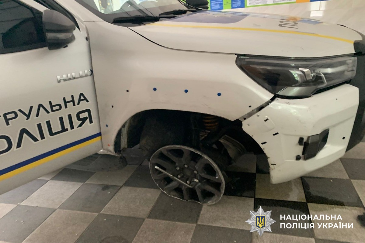 Під час здійснення евакуаційних заходів у районі Антонівки службовий автомобіль управління патрульної поліції наїхав на протипіхотну міну. Внаслідок цього транспортний засіб отримав пошкодження правої частини кузову та переднього правого колеса. Співробітники поліції не постраждали.