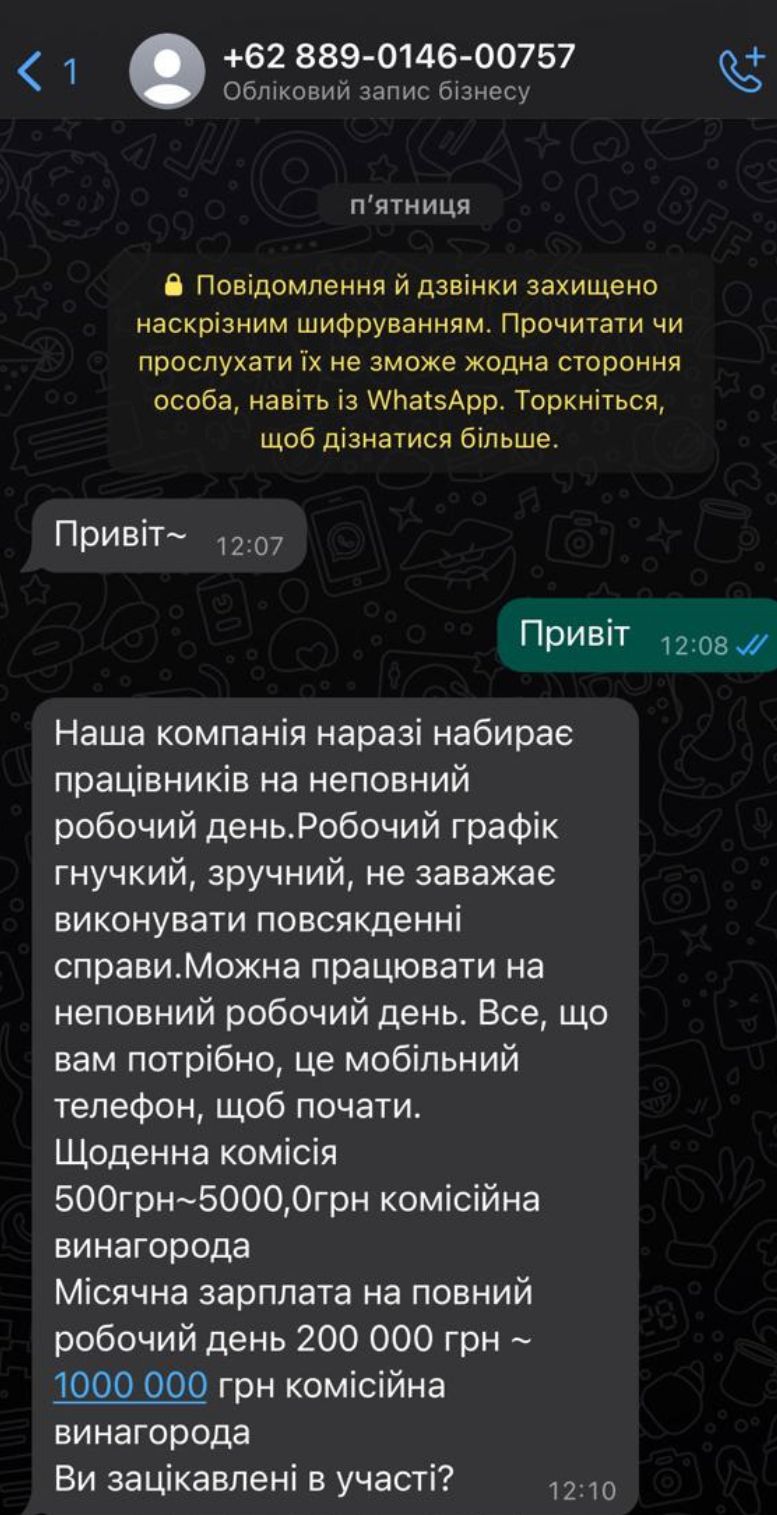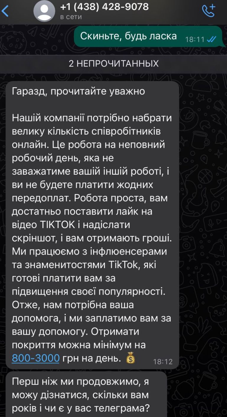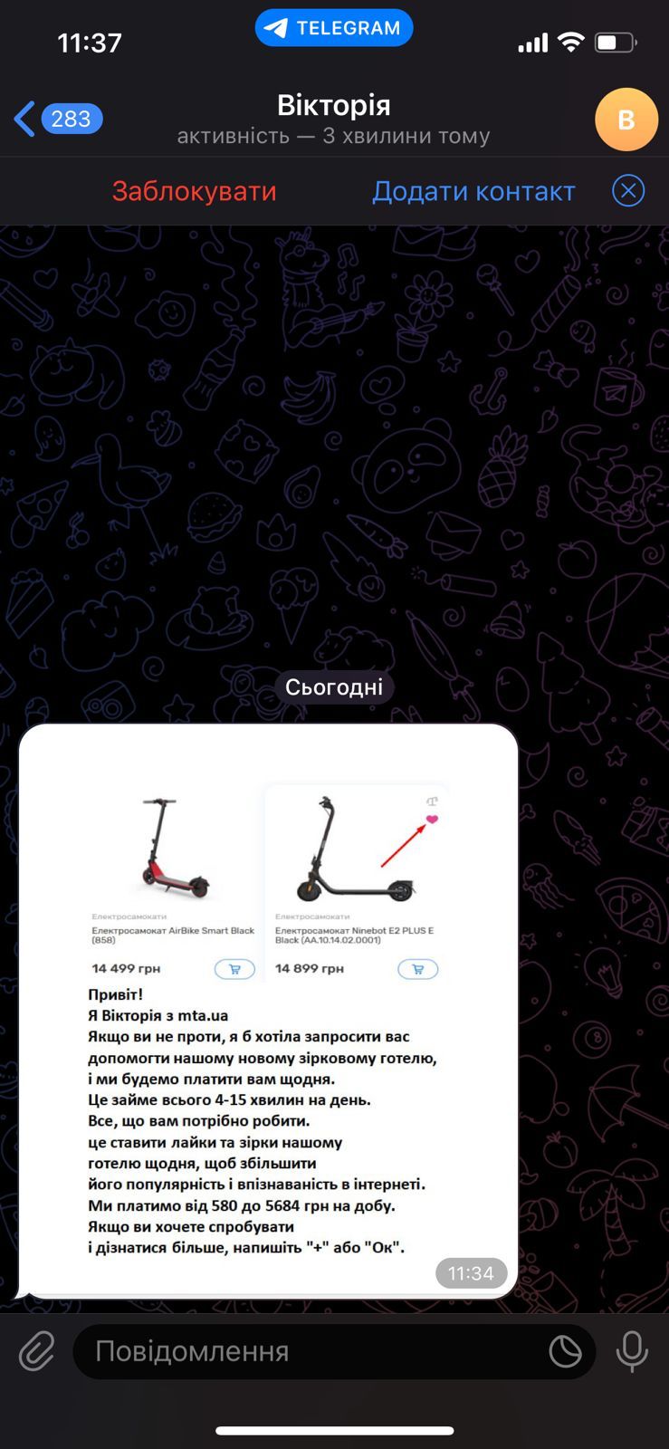 З'ясовано, що потерпіла знайшла інформацію в месенджері «Телеграм» про додатковий дохід онлайн. Їй пропонували бронювати готельні номери та ставити «вподобайки». За таку роботу жінці обіцяли чималу винагороду.