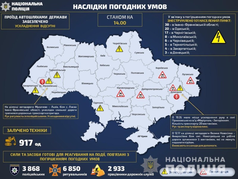 Задля надання допомоги громадянам, яких негода застала в дорозі, поліцейські несуть службу в поселеному режимі. Вони забезпечують безпеку дорожнього руху спільно з рятувальниками та Національною гвардією.