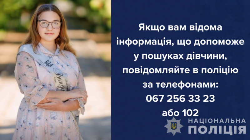 Звертаємось до всіх, кому відома будь-яка інформація про зниклу, її місцеперебування або інші відомості, що можуть стати корисними у пошуках, повідомляти за телефонами: 0672563323 або 102.