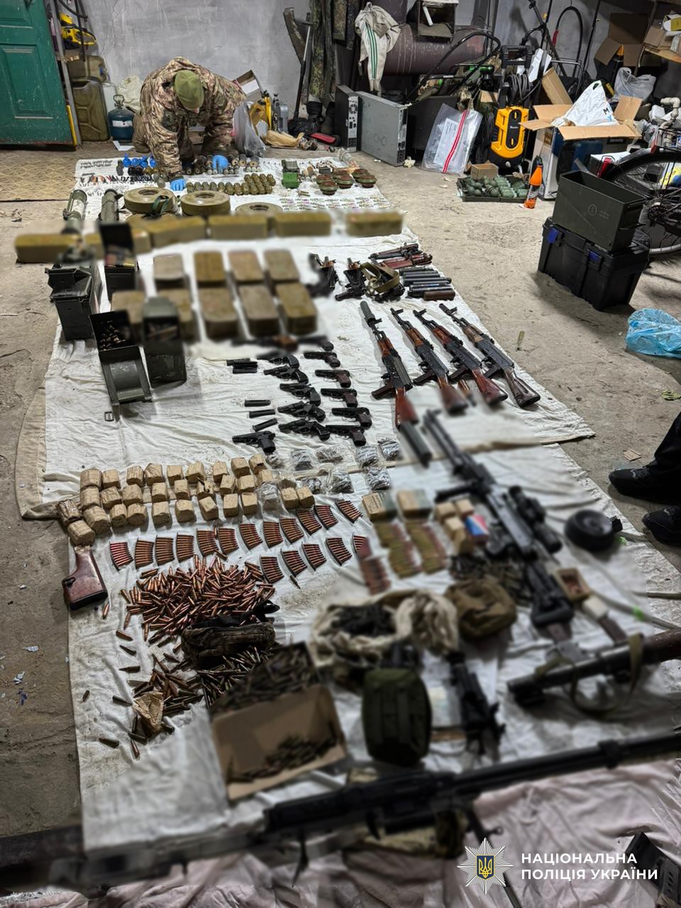Під час заходів правоохоронці виявили схрон зброї: 48 автоматів Калашникова, 26 пістолетів Макарова, 4 кулемети, 8 одиниць іншої нарізної вогнепальної зброї, 4 гранатомети та 31 постріл до гранатометів, 8 мін, 76 гранат, майже 26 000 набоїв різного калібру, запали, підривачі, детонатори, майже 21 кілограм вибухівки, глушники, димові шашки, багнет-ножі, споряджені магазини. Крім того, вилучено готівку - понад 3 000 євро та автомобіль.