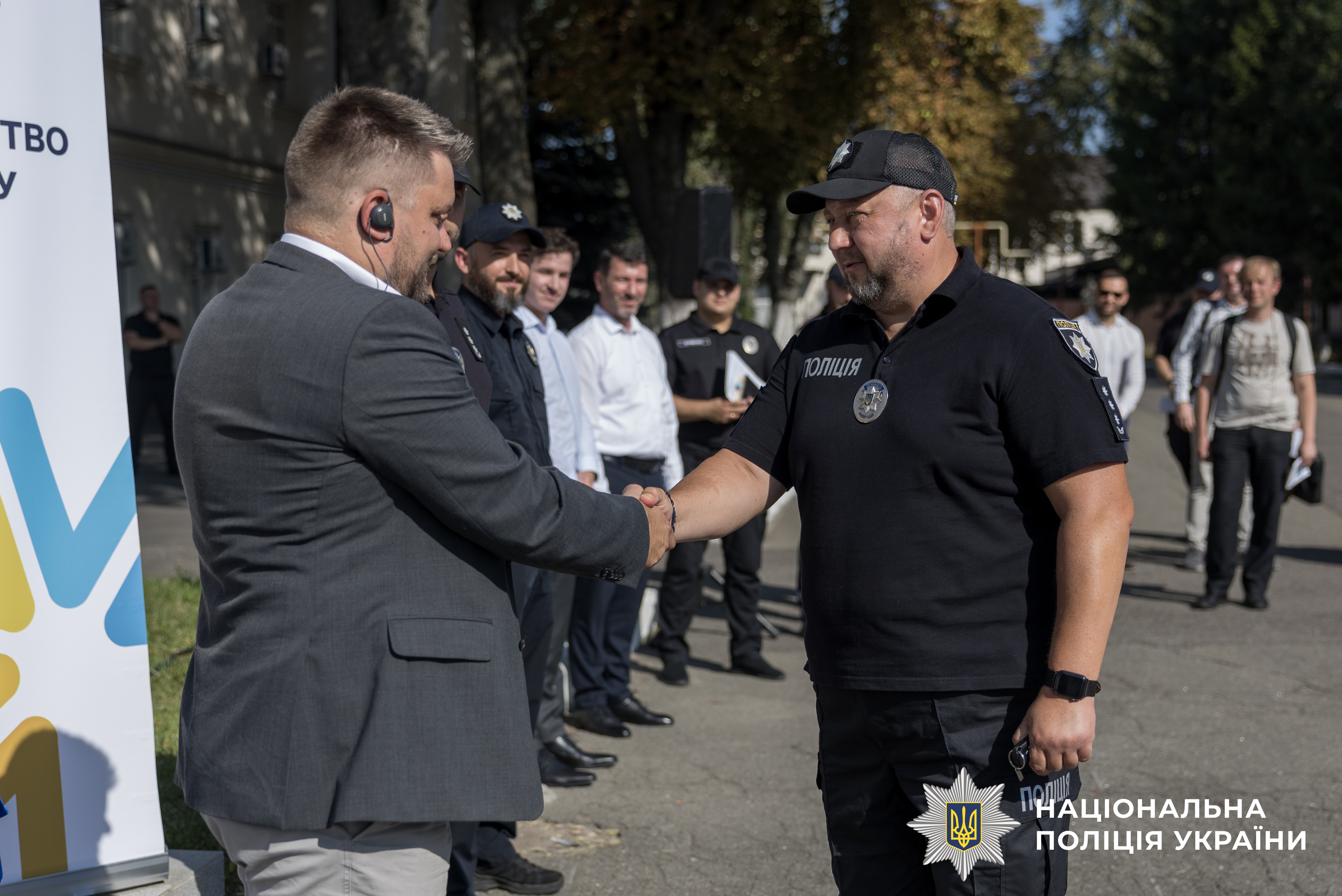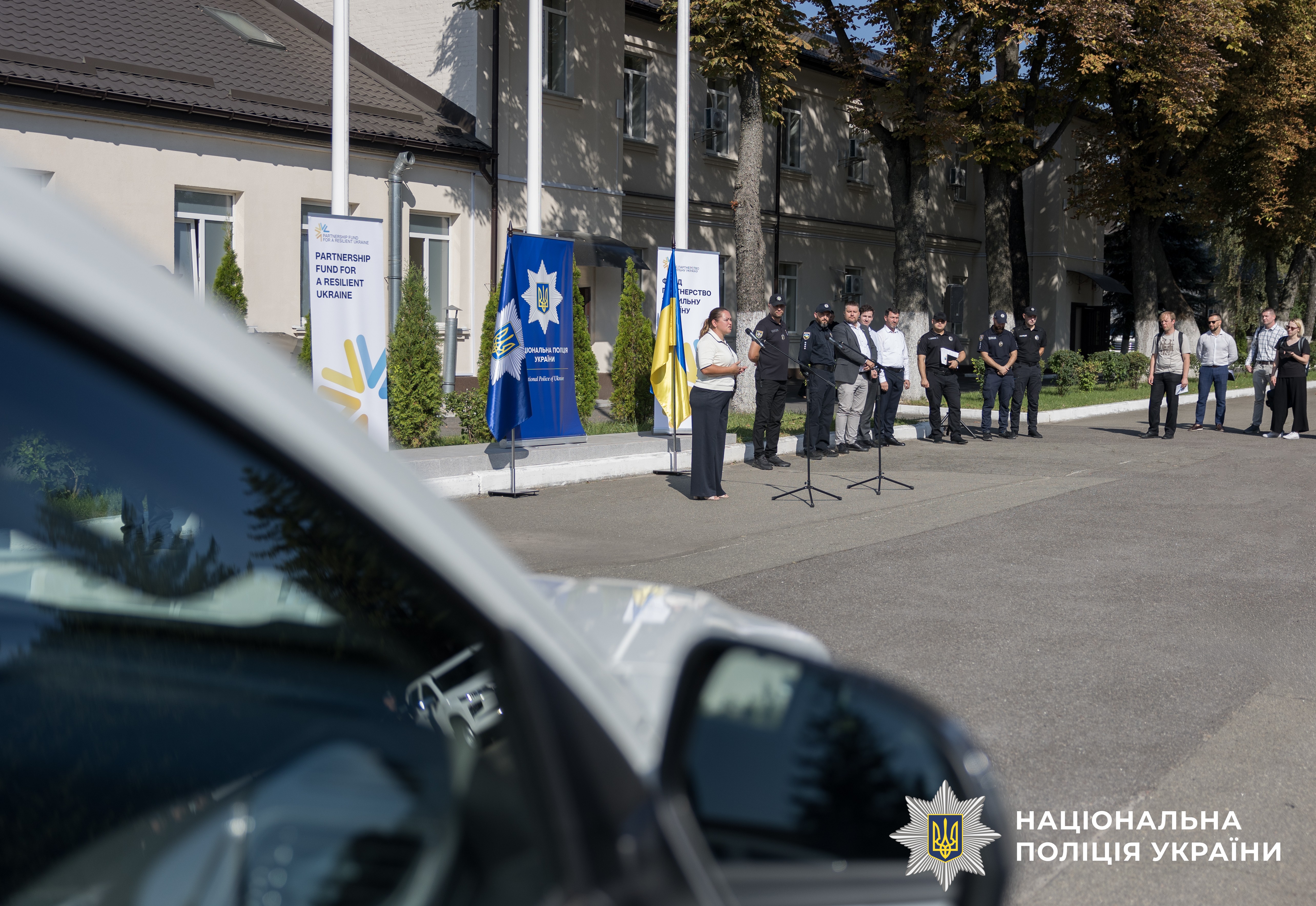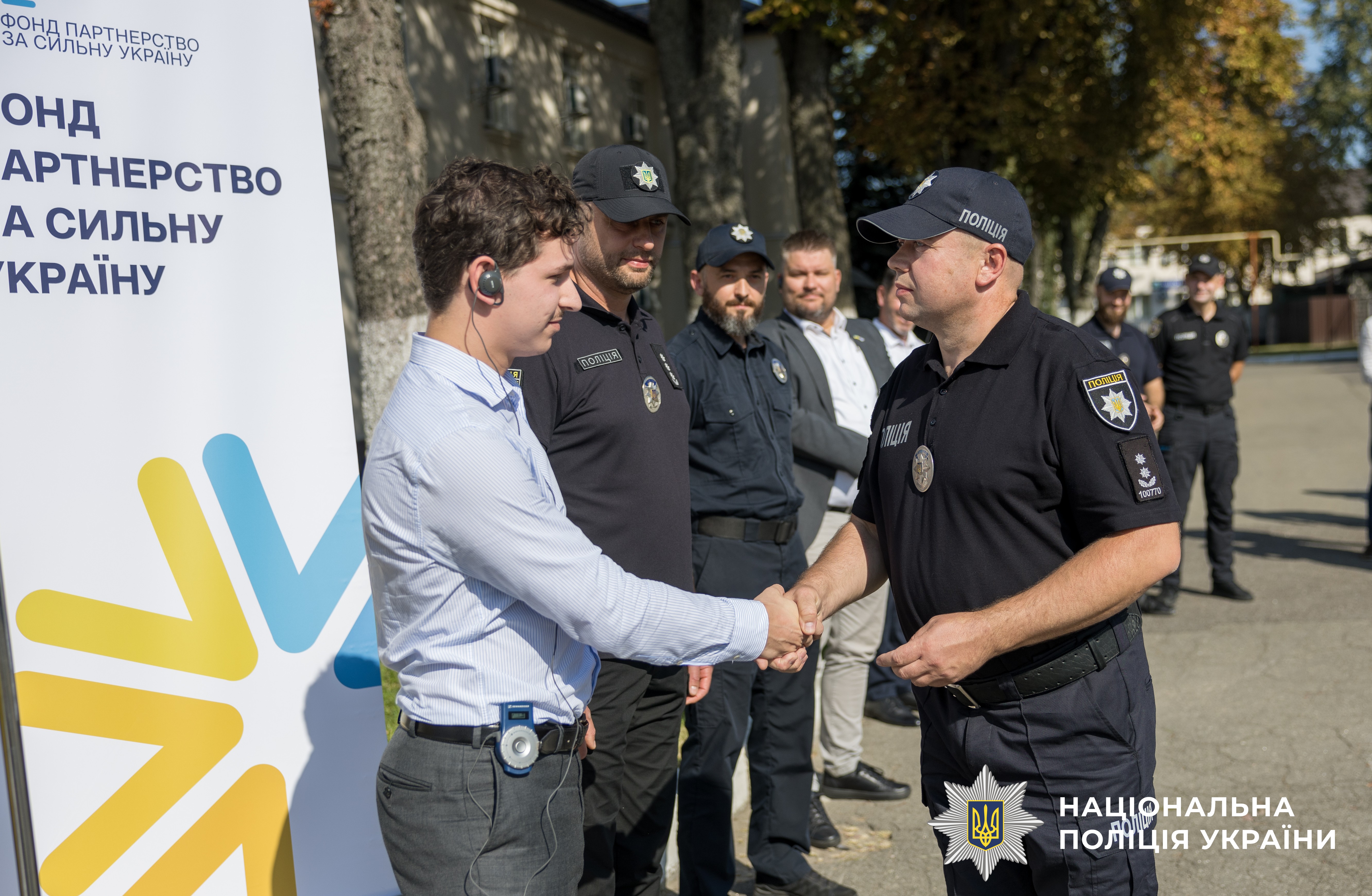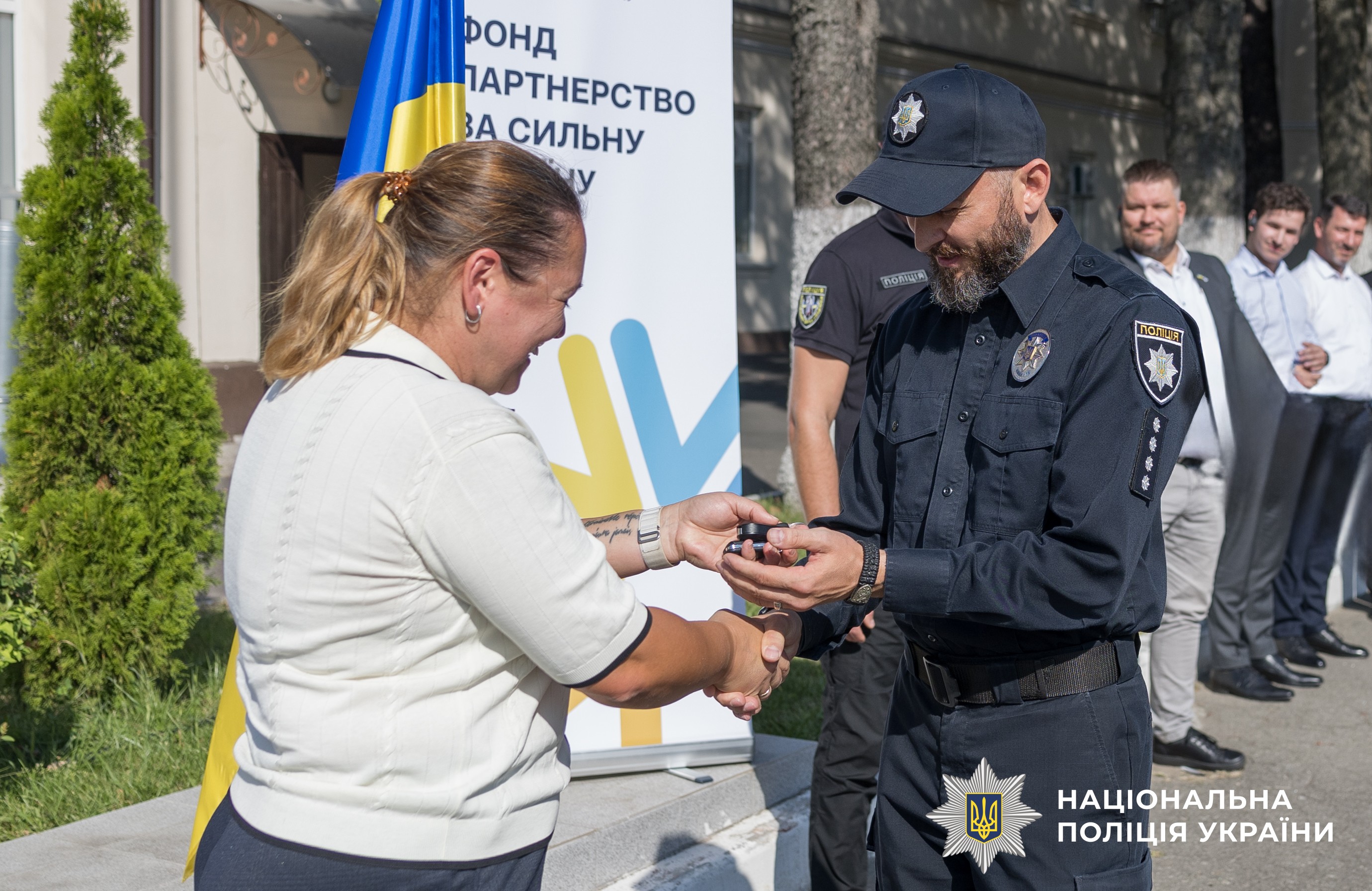 Ключі від автомобілів поліцейським вручили представники Фонду «Партнерство за сильну Україну» Ірина Тушницька та Астріт Істрефі, а також другий секретар з політичних питань Посольства Королівства Нідерландів у Києві Даро Емад Накшбанде та офіцер зв'язку поліції Північних країн Посольства Фінляндії в Україні.