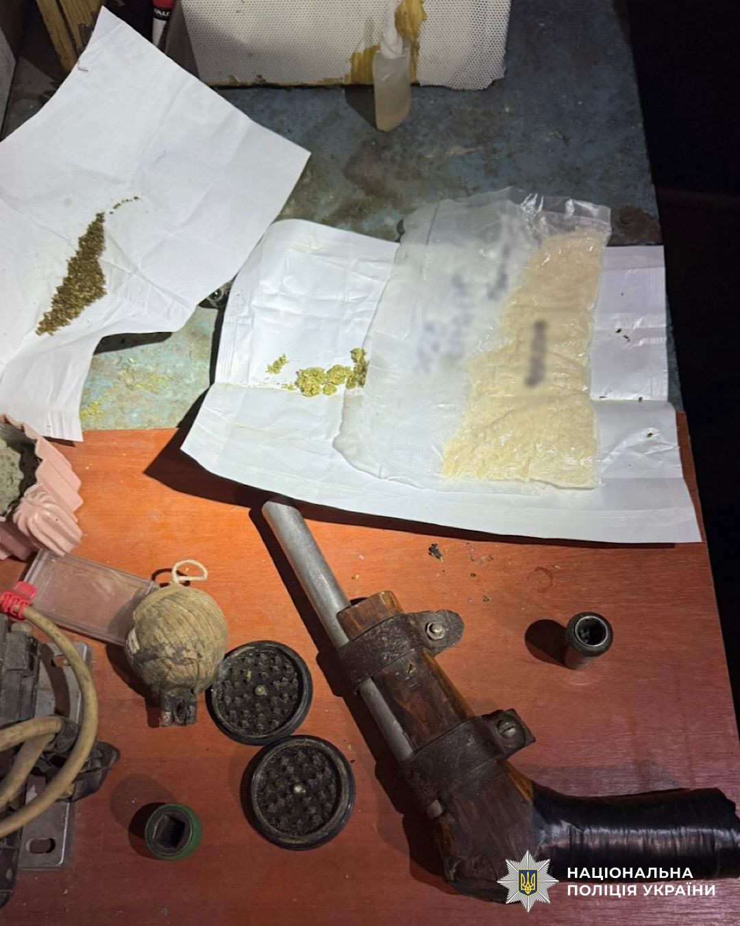 Один з учасників групи зберігав зброю на прибудинковій території, а під час обшуку у нього також виявили близько кілограма марихуани та 100 грамів метамфетаміну.