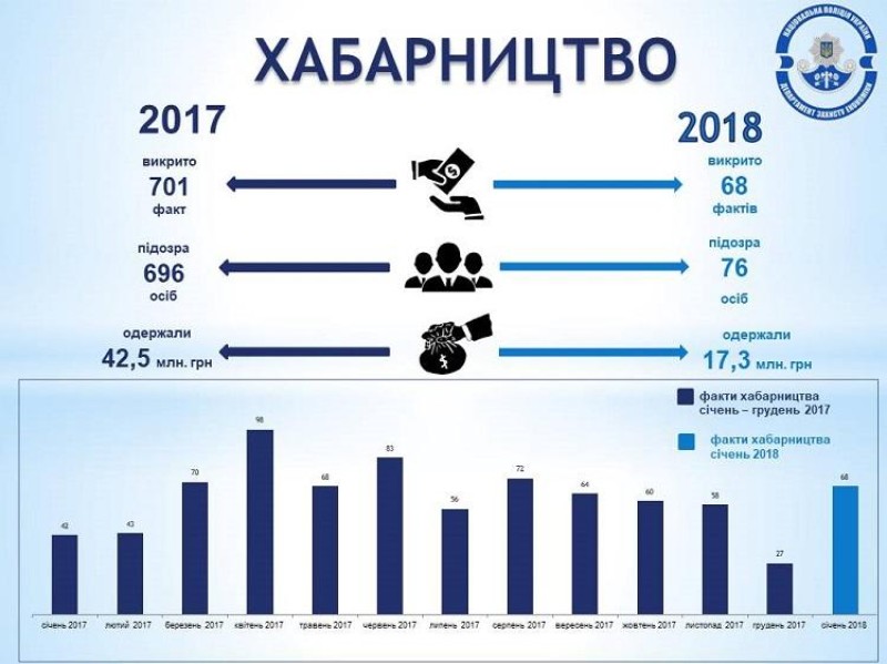 Протягом 2017 року працівники Департаменту захисту економіки Нацполіції та його структурними підрозділами було задокументовано 701 факт хабарництва на суму 42,5 мільйона гривень.