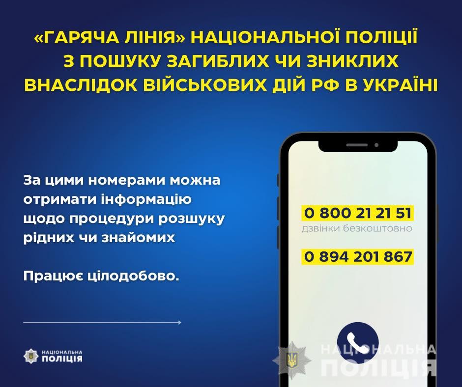 Нагадуємо: Національна поліція України відкрила «гарячу лінію» для родичів загиблих внаслідок військових дій рф.