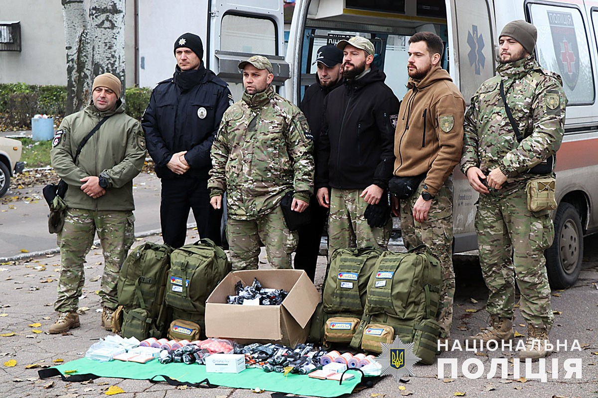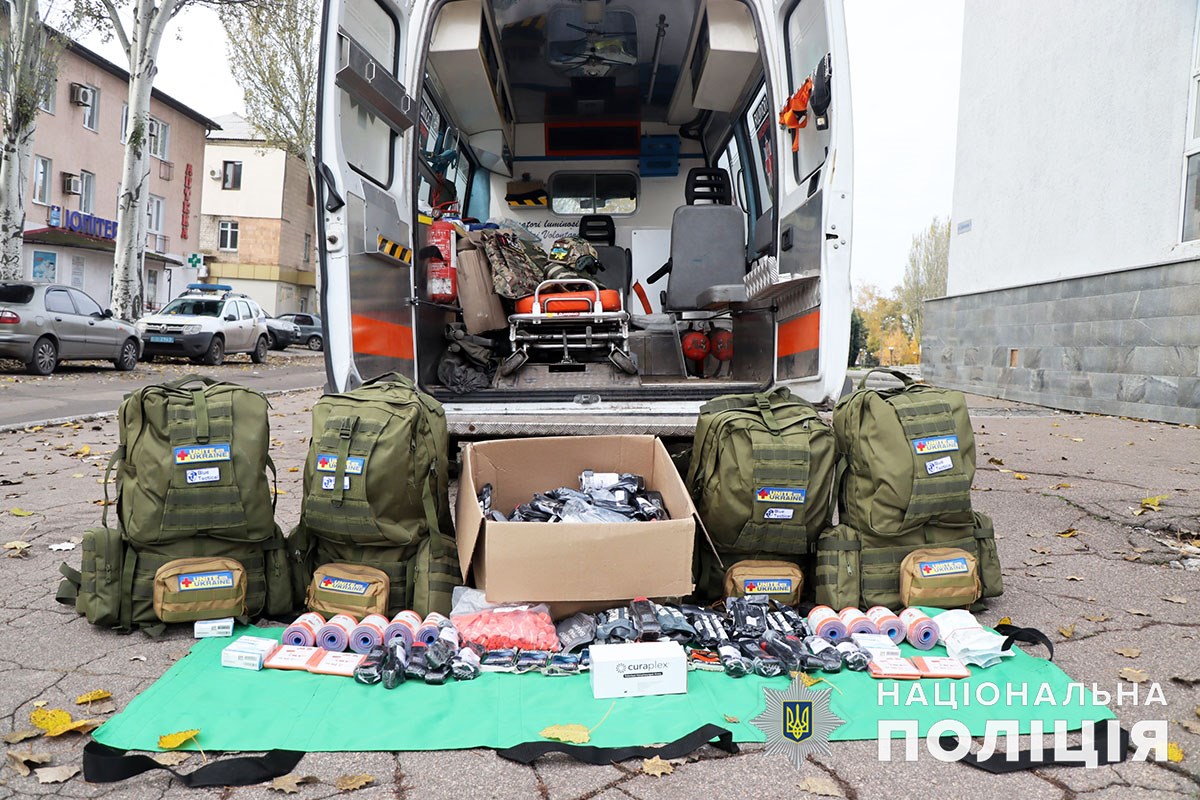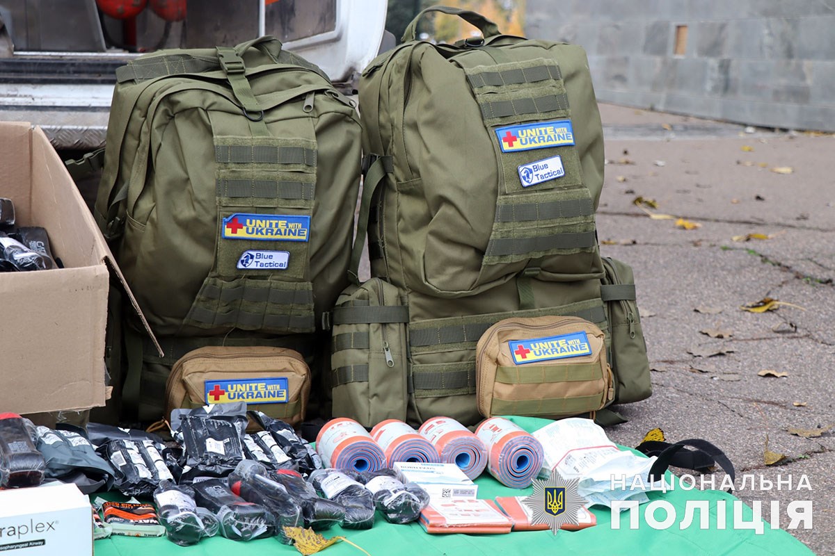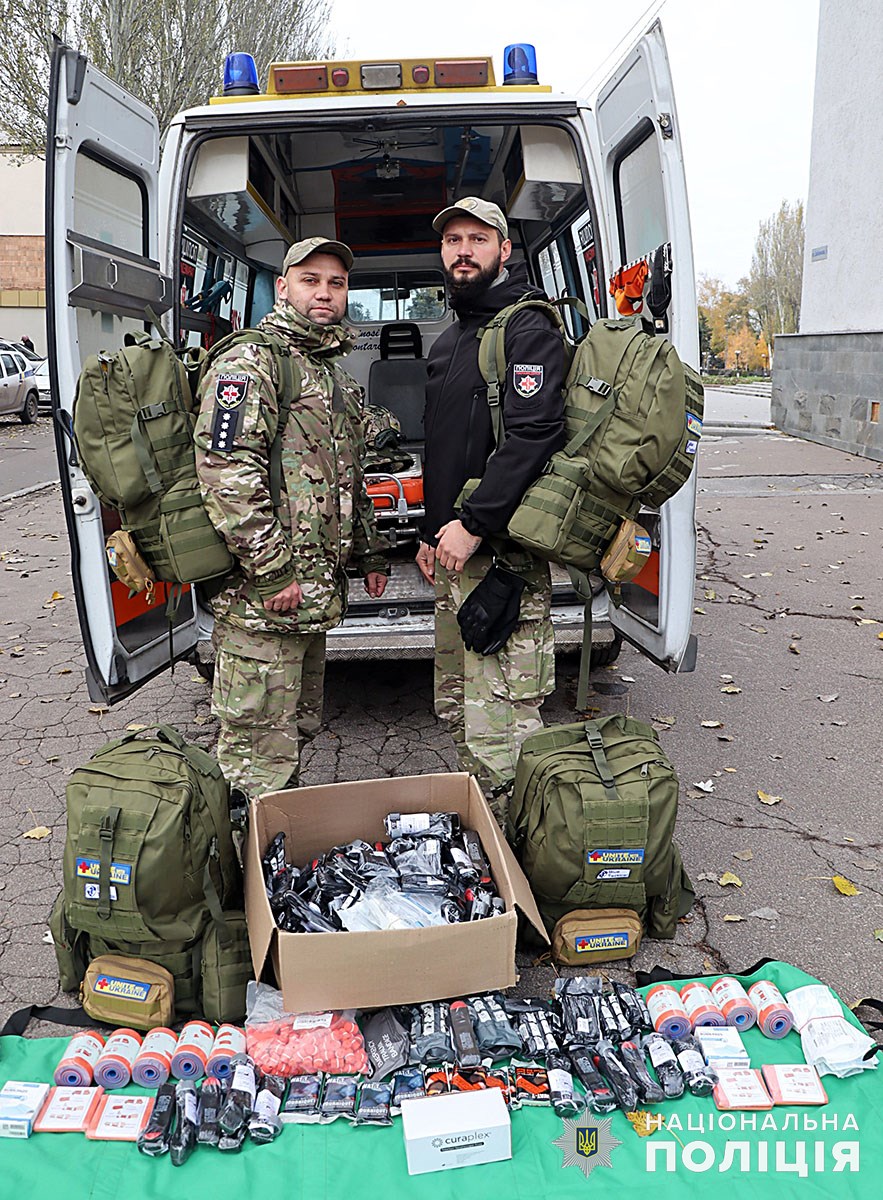 Представники української діаспори передали поліцейським п’ять тактичних рюкзаків з усім необхідним для порятунку життя. Медичні набори використовуватимуть парамедики, які несуть службу біля лінії фронту та в деокупованих містах.