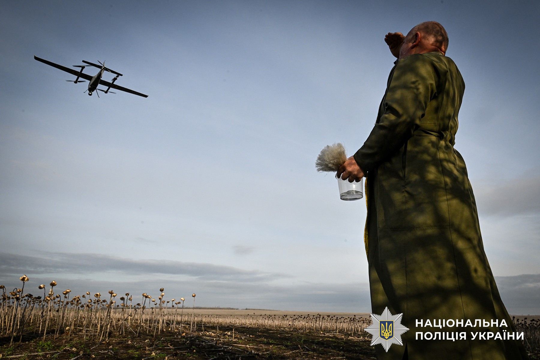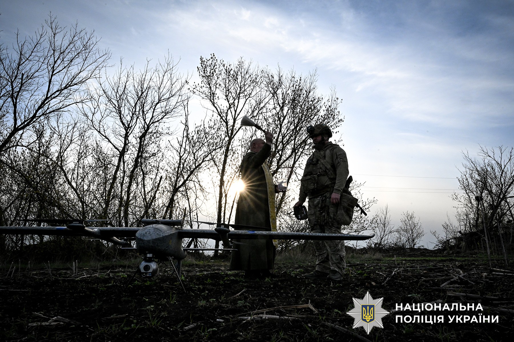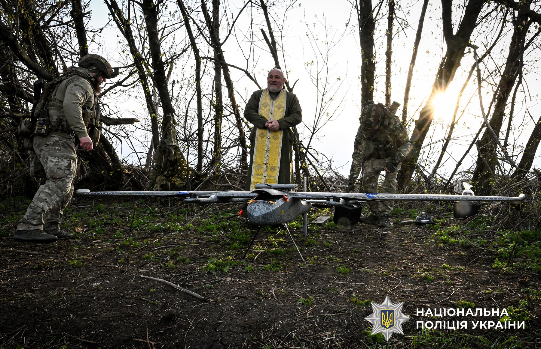 Зі словами підтримки та благословення на переможну справу отець Степан звернувся до поліцейських-пілотів бомбера «Гара». А ще - окропив бійців свяченою водою.