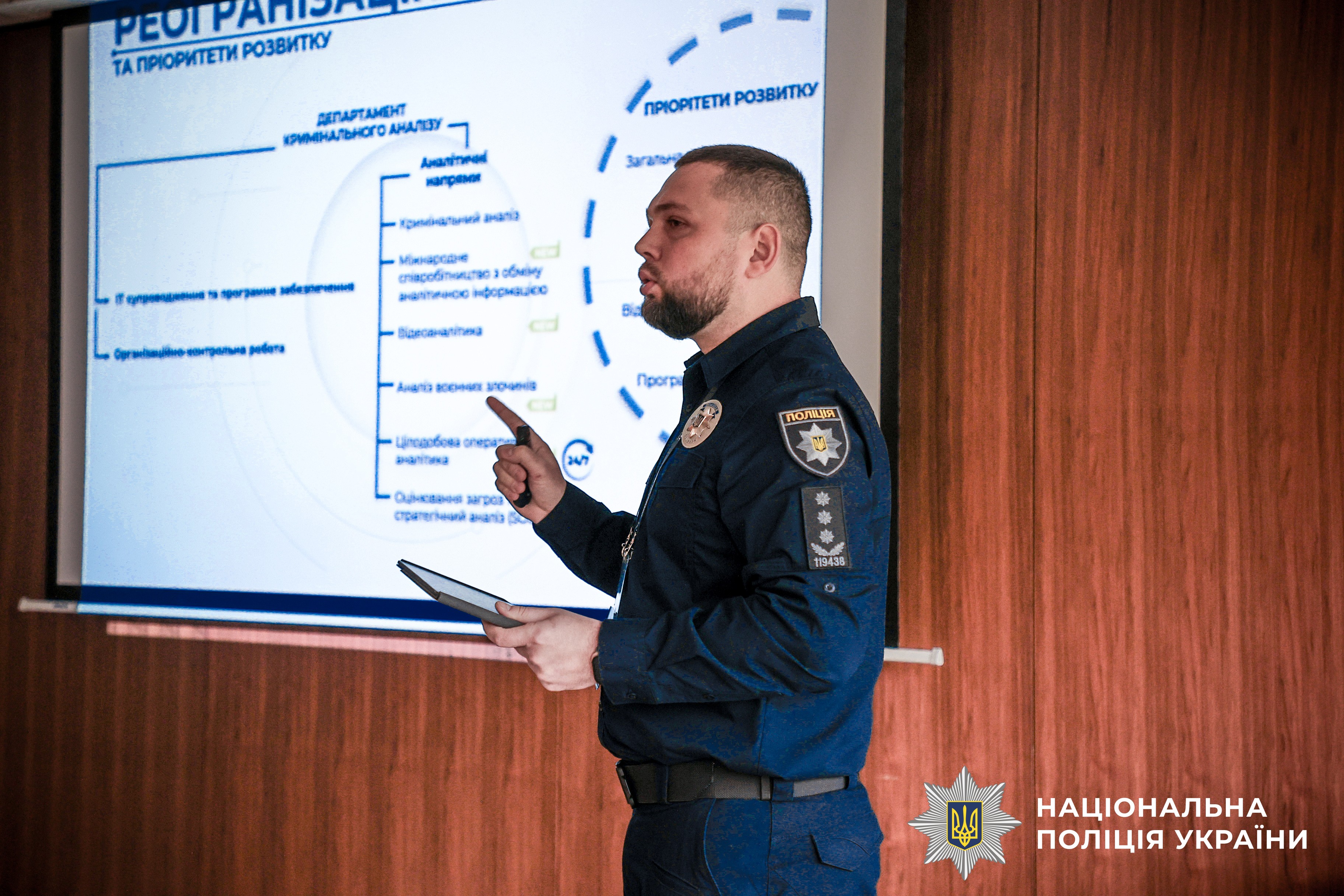 Крім того, під час дводенного хакатону для учасників проводились лекції з профільних тем. Одним із спікерів виступив начальник Департаменту кримінального аналізу Роман Бутко з темою «Розвиток кримінального аналізу в Національній поліції України в умовах воєнного стану. Програмне рішення для відеоаналітики: відеозвіти як інструмент аналітики по воєнним злочинам».