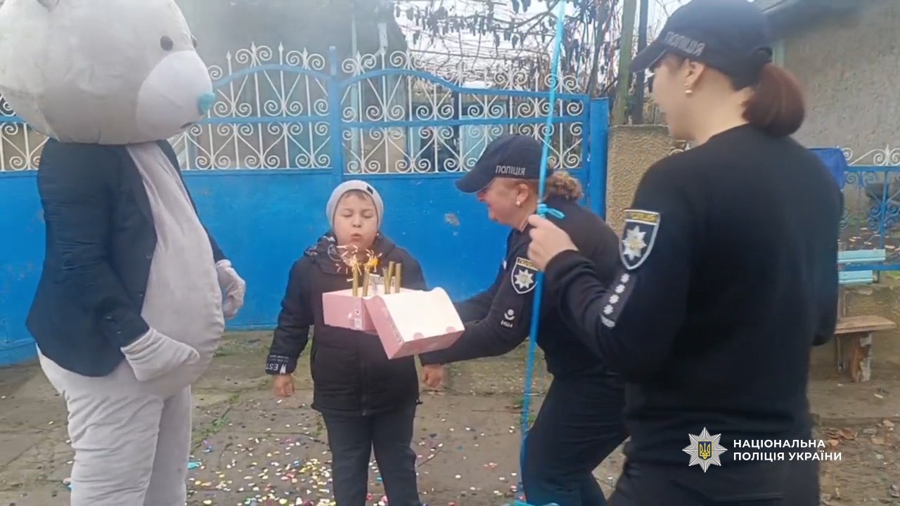 Микита навчається у першому класі, тому поліцейські подарували йому сучасний планшет для навчання. Також поліцейські запросили казкового героя – великого ведмедика, який розважав та вітав дитину. Святковий торт, солодощі та яскраві кульки додали дому справжньої атмосфери дитячого свята.