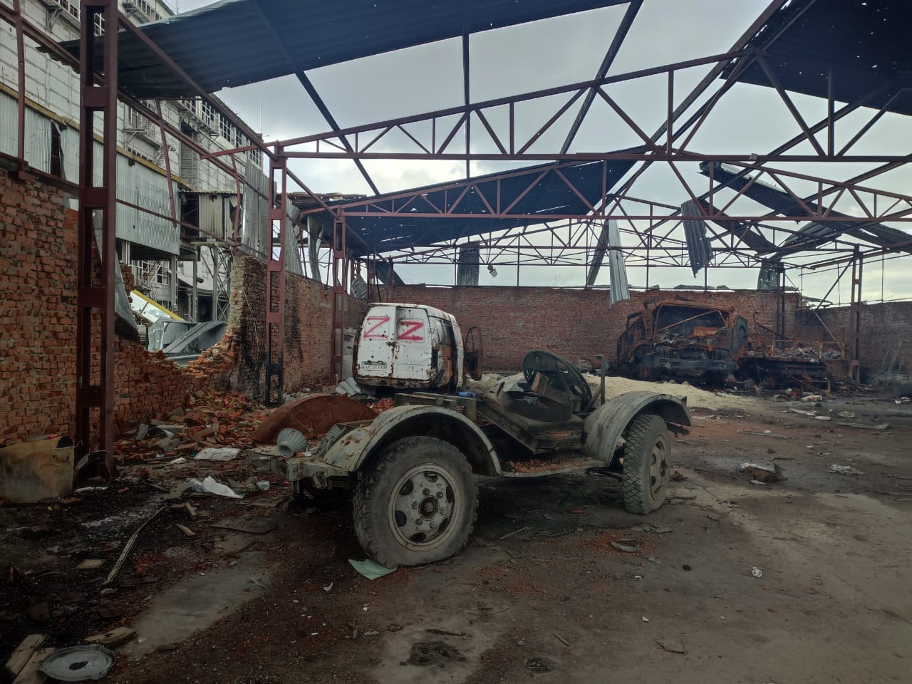 На території підприємства ворожі війська залишили руїни та купу сміття, серед якого шприці російського виробництва, медикаменти, георгіївські стрічки та форма військових російської федерації.
