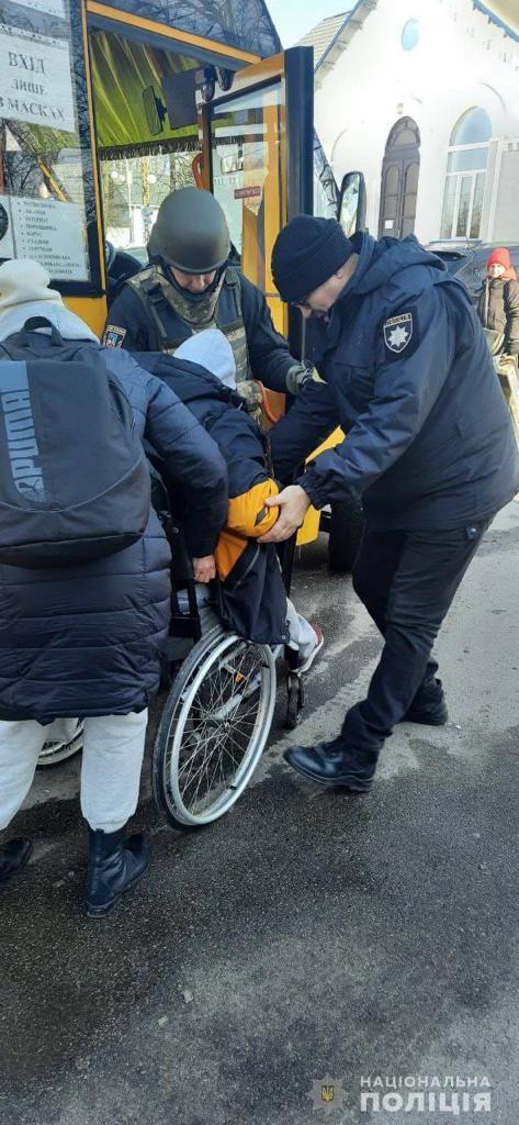 Під час евакуації населення співробітники поліції діють оперативно. Особлива увага звертається на людей з обмеженими можливостями, правоохоронці допомагають їм дістатися до транспорту.