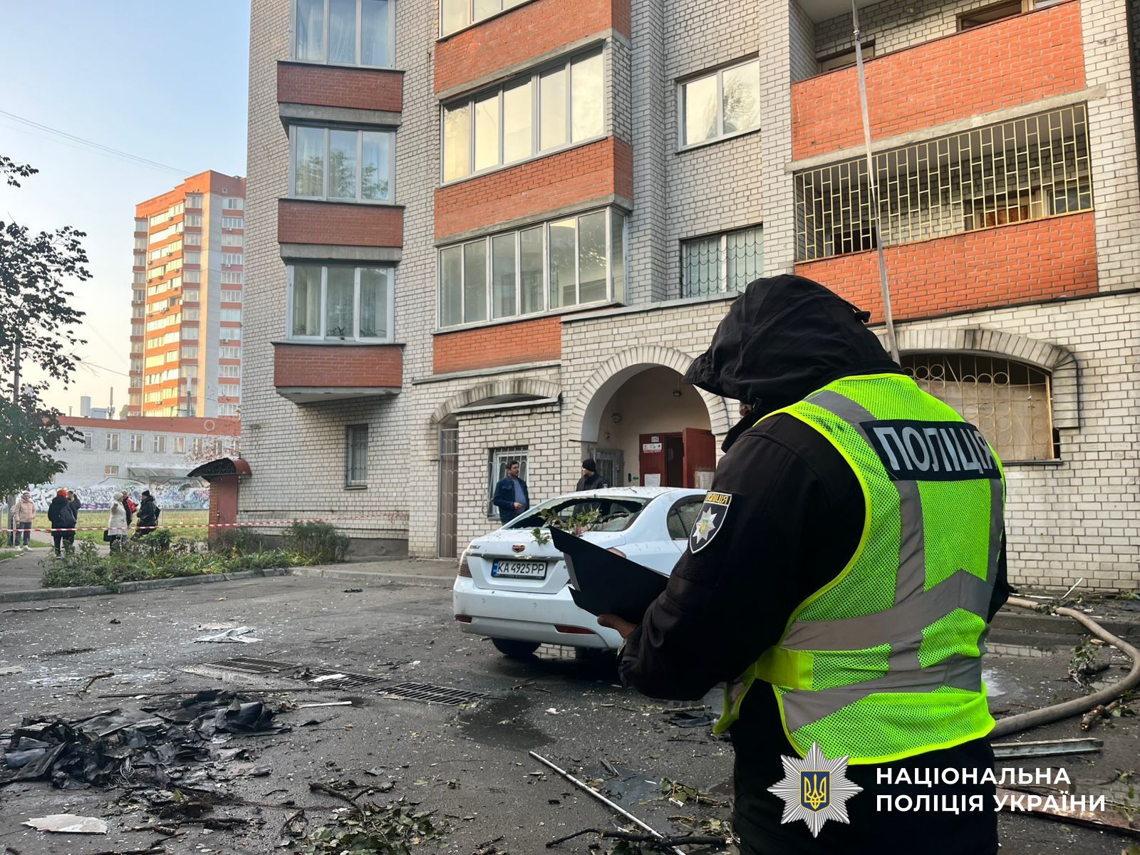 Печерський район. Безпілотник влучив у 20-поверховий будинок на верхньому поверсі. За іншою адресою пошкоджено автомобіль у дворі.