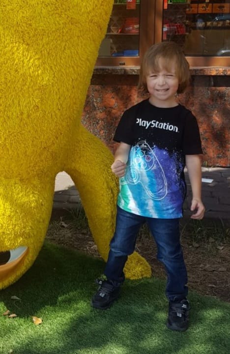 Хлопчик одягнутий в чорну спортивну куртку, чорні штани та сіру шапку.