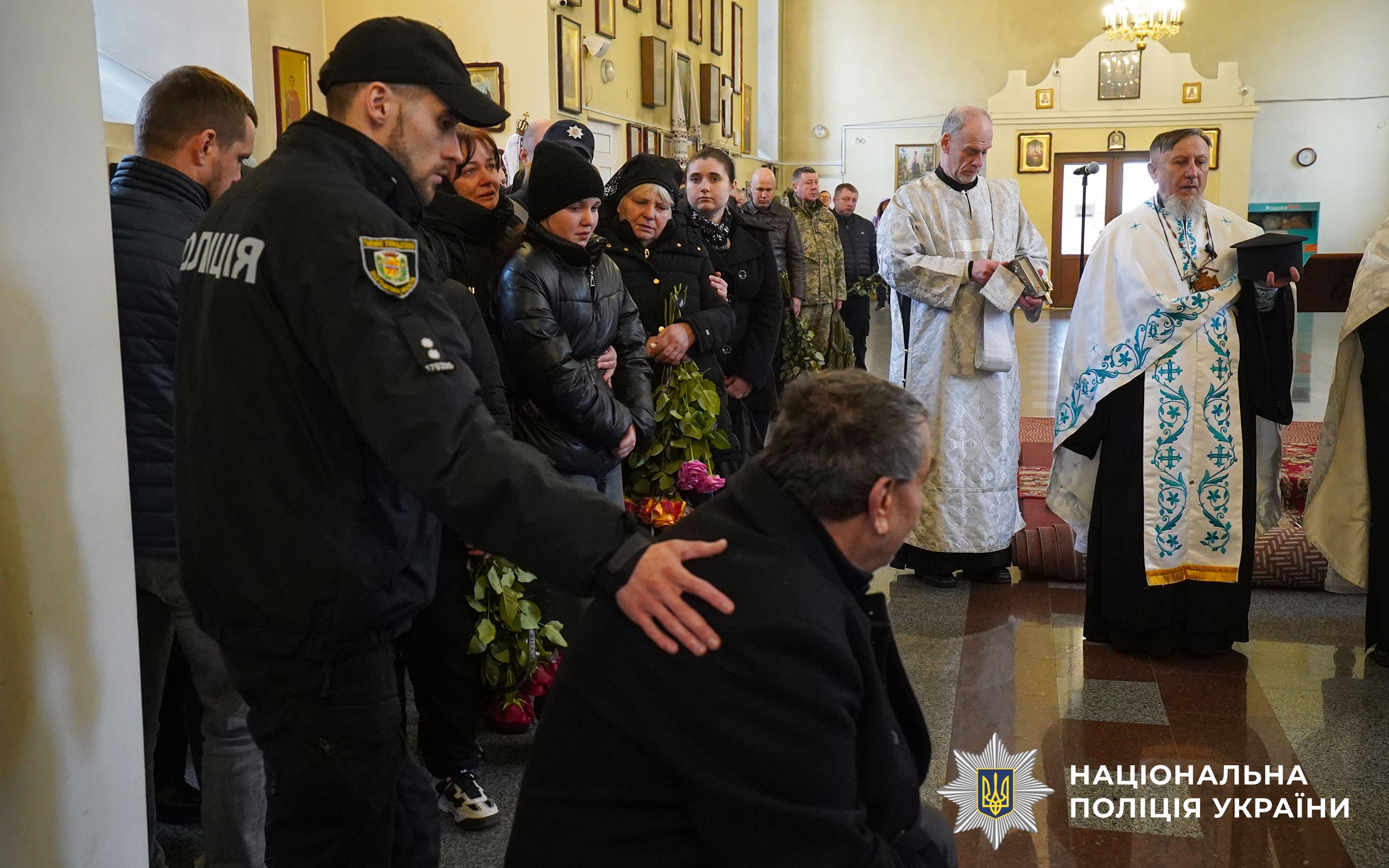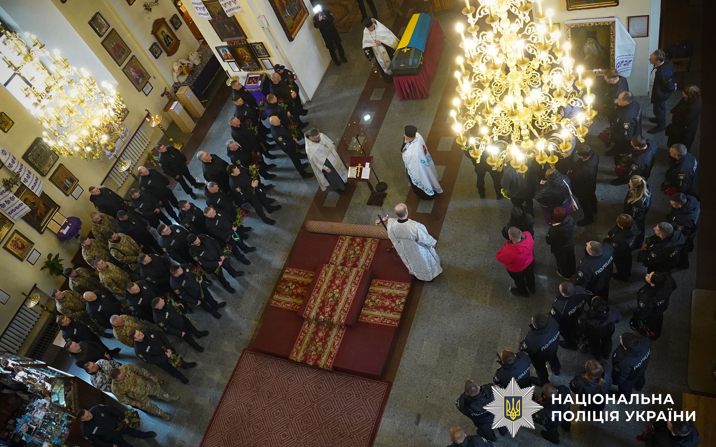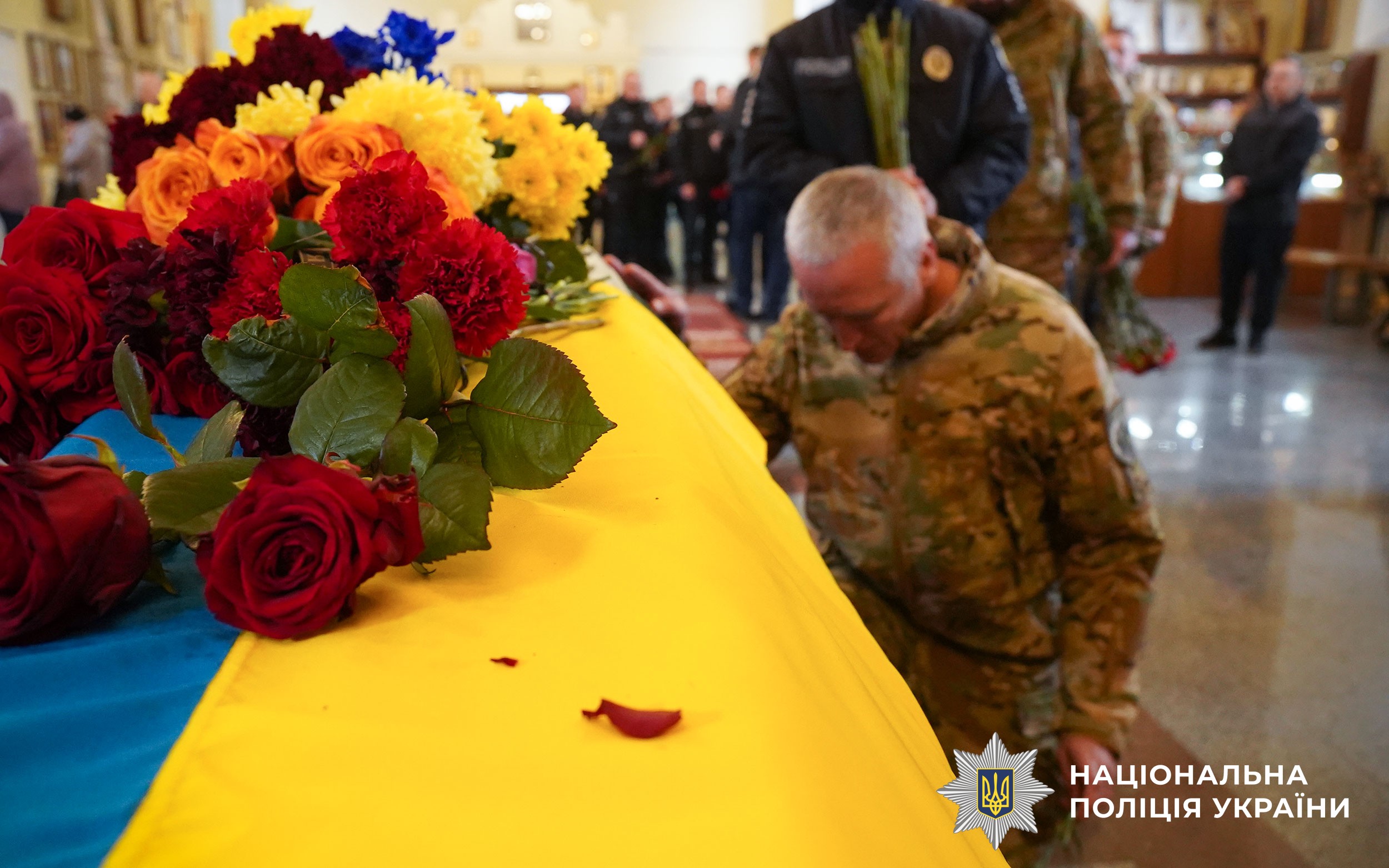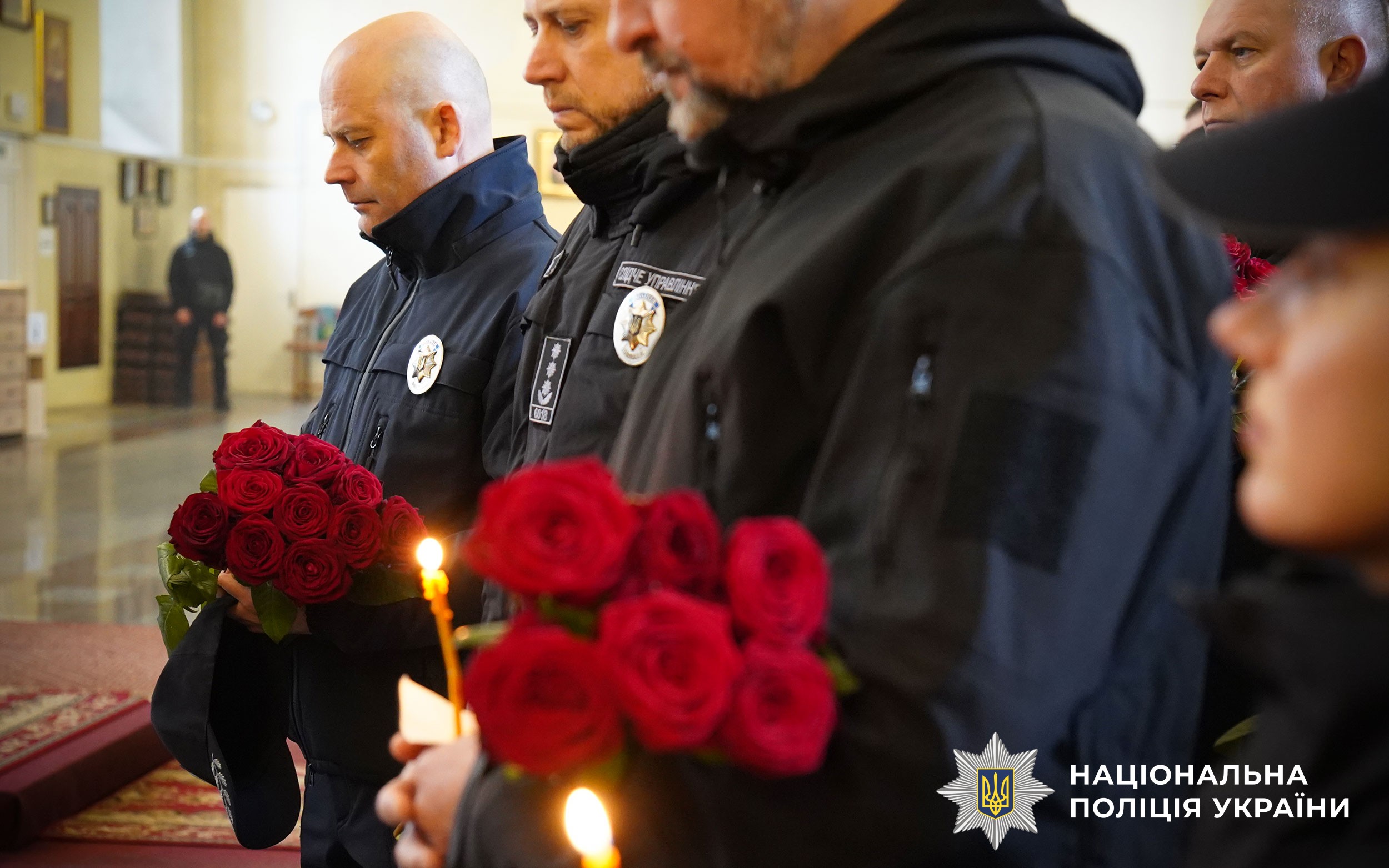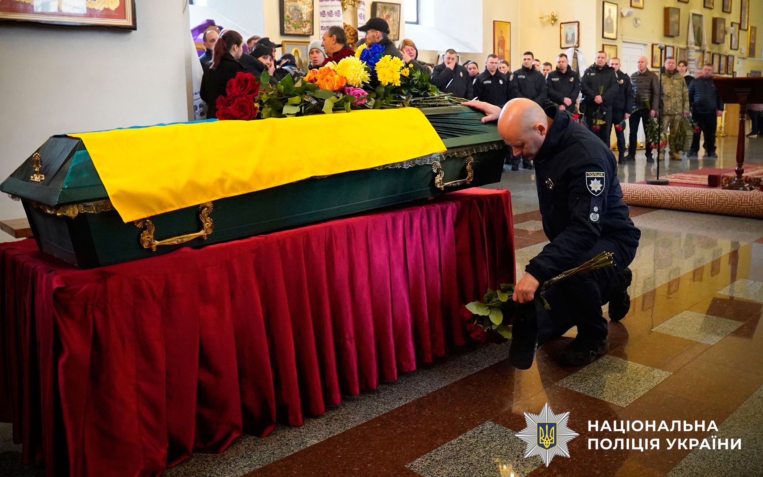 Церемонія прощання розпочалася у Свято-Успенському кафедральному соборі Полтави. Аби віддати шану колезі, особовий склад поліції разом із мешканцями міста утворили живий коридор пошани. Схиливши голови та ставши на коліна, громада та колеги провели Героя в останню путь.