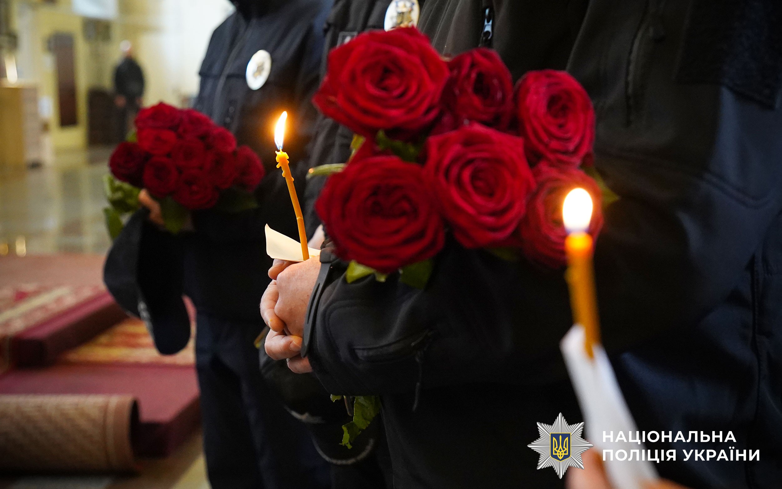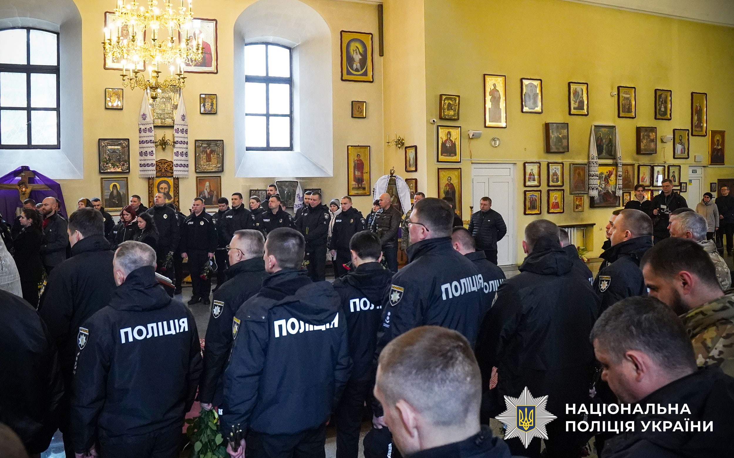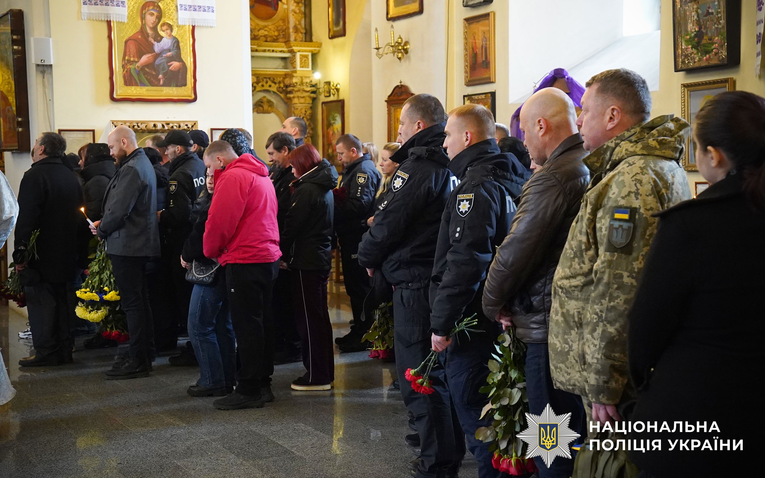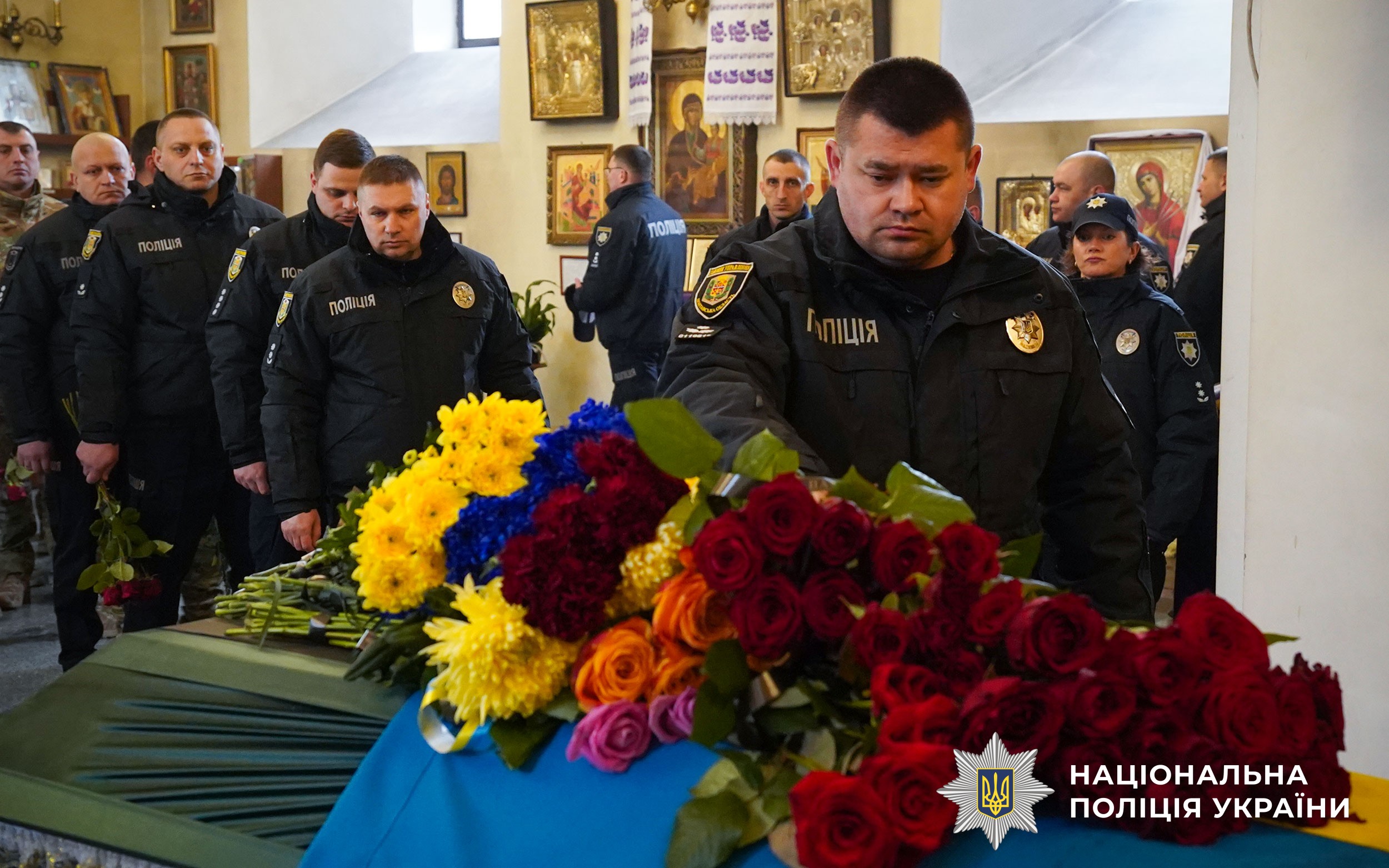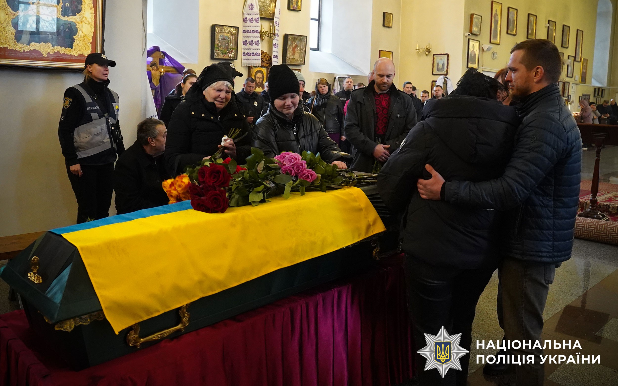 Церемонія прощання розпочалася у Свято-Успенському кафедральному соборі Полтави. Аби віддати шану колезі, особовий склад поліції разом із мешканцями міста утворили живий коридор пошани. Схиливши голови та ставши на коліна, громада та колеги провели Героя в останню путь.