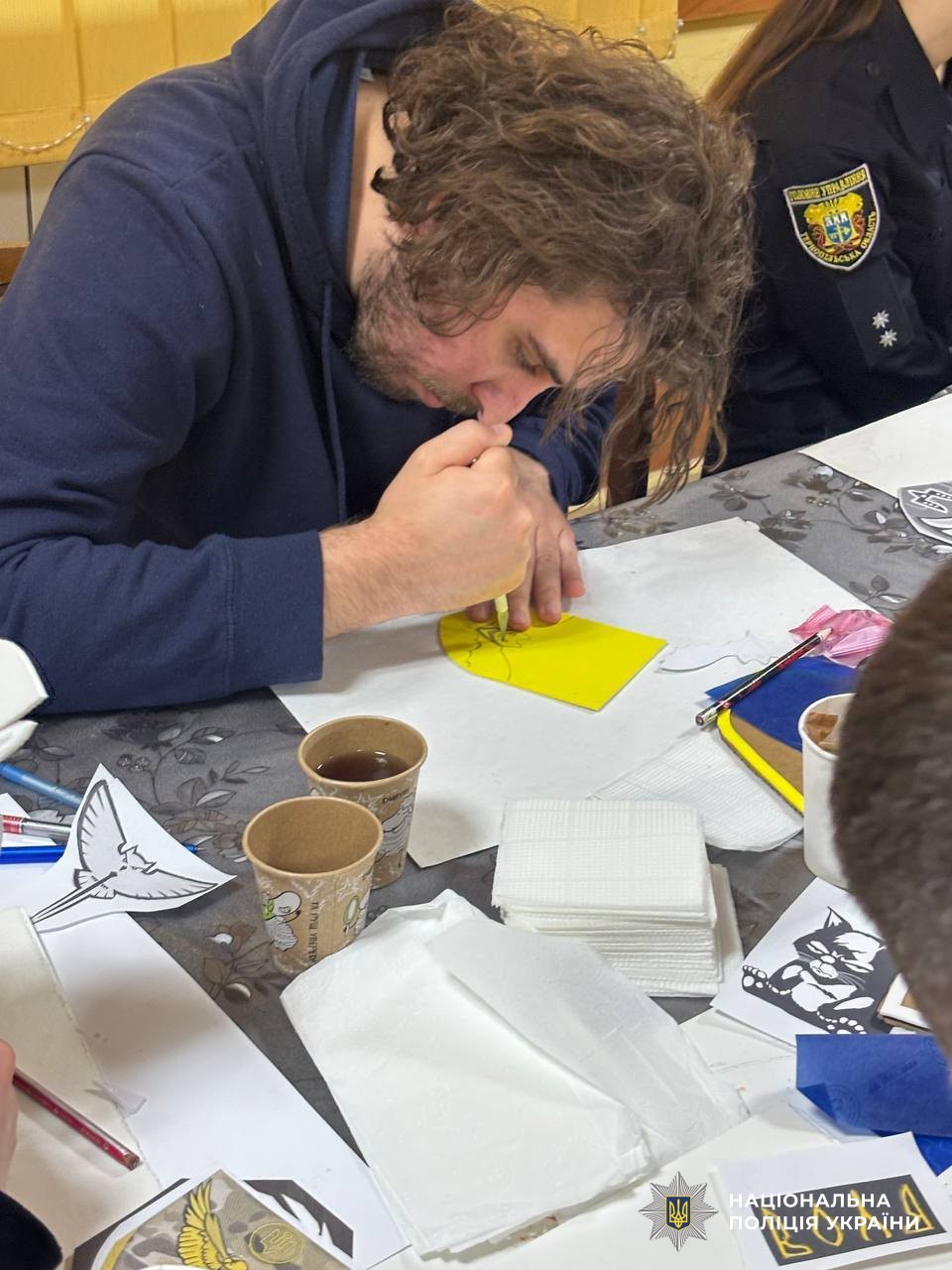 Під час заняття учасники працювали з кольоровим папером, картоном, трафаретами та інструментами для точної вирізки. Спершу кожен обирав ескіз або створював власний дизайн, продумував символіку, кольори та деталі майбутнього виробу. Після цього військові вирізали елементи, формували основу, наклеювали шари та промальовували контури. Деякі роботи учасники доповнили авторськими написами й знаками, які мають для них особисте значення.
